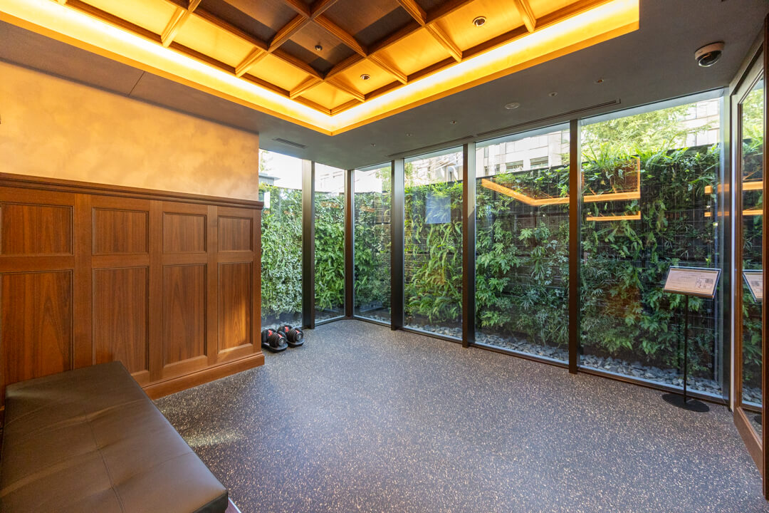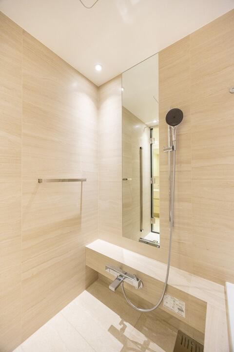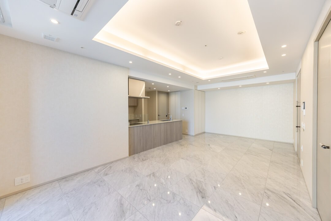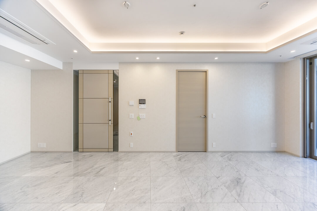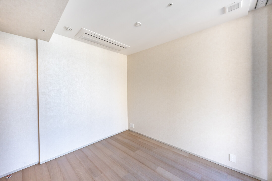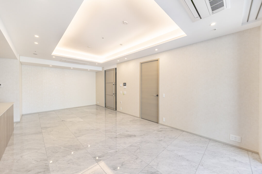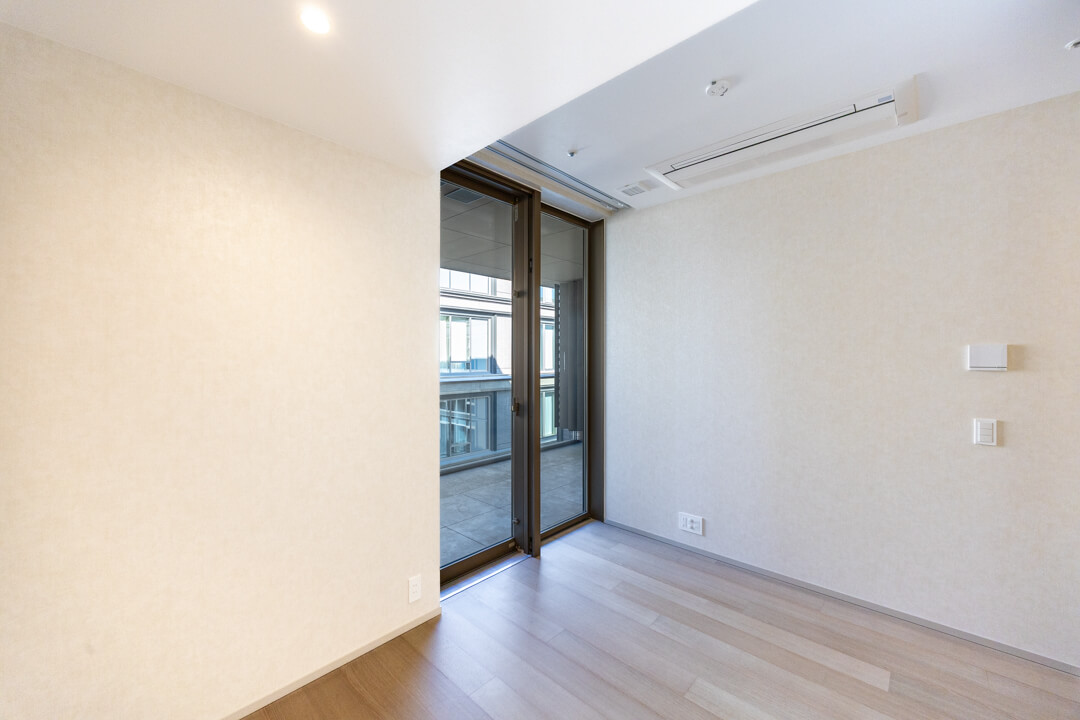 つやつやとした光沢感のあるタイル貼りの床で、ホテルライクな上質な雰囲気。床暖房が設置されており、冬場でも足元からじんわりと温まれます。床に直接座ったり、寝転んでもひんやり感なく暖かく過ごせます。ビルトインエアコンも2基設置されていて、室内の温度調整もスムーズに行えます。