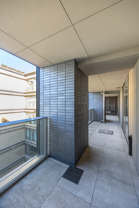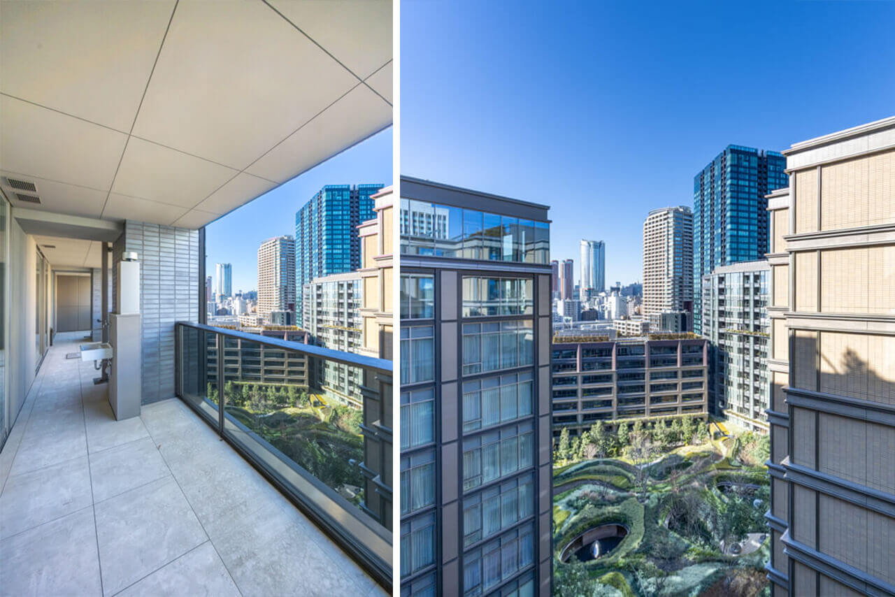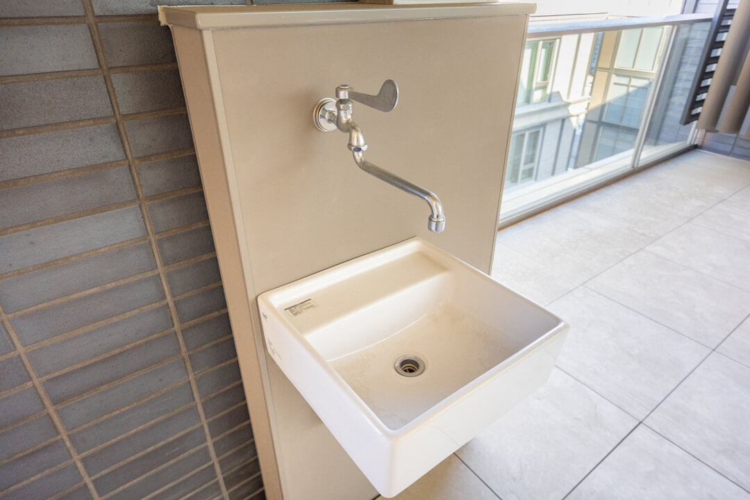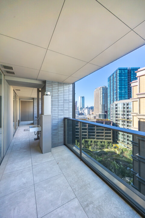 全居室に面した約27㎡のゆとりある広さのバルコニー。手すりが半透明になっていて、景色を遮らず開放的。バルコニーからは中庭の美しい緑が望め、都心でありながら自然の潤いを身近に感じられます。また、バルコニーにはスロップシンクも付いていて植物なども水やりに便利です。