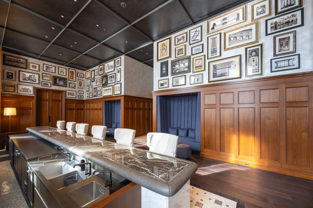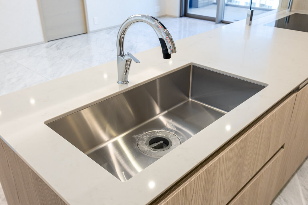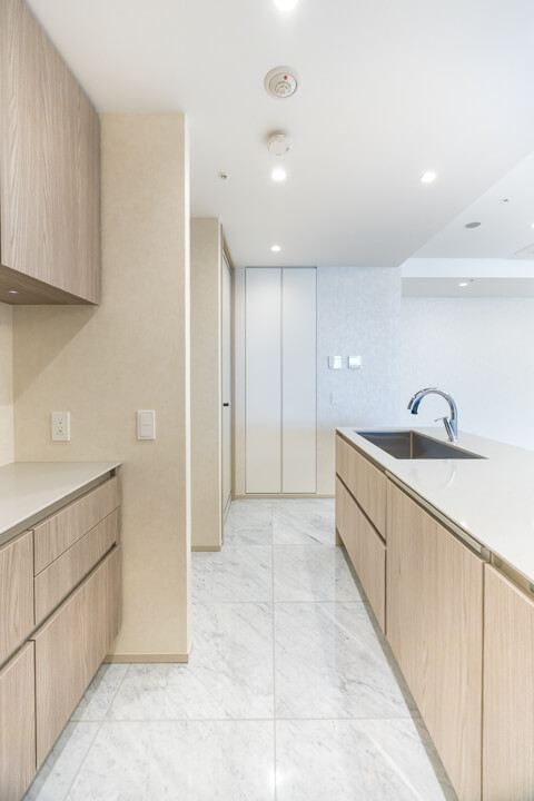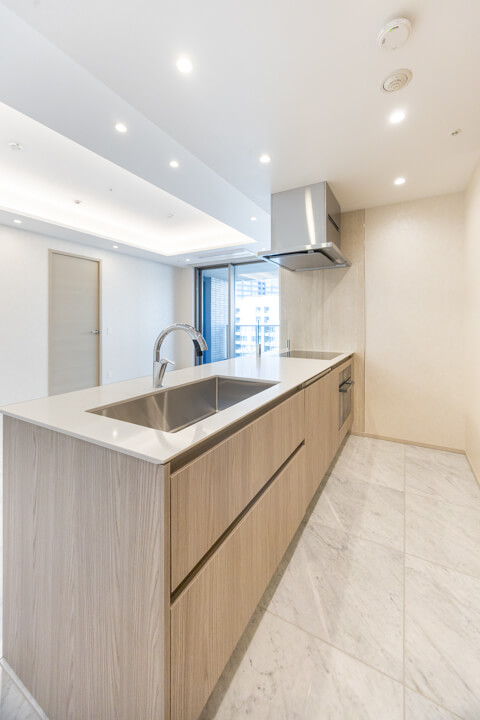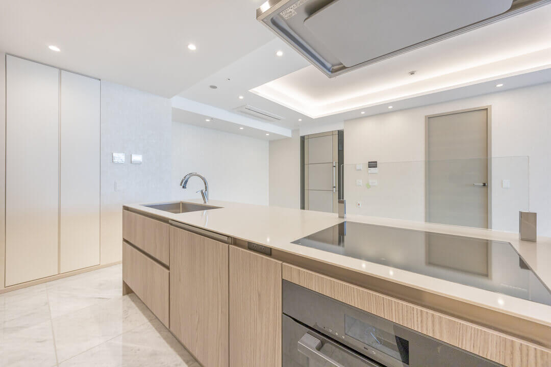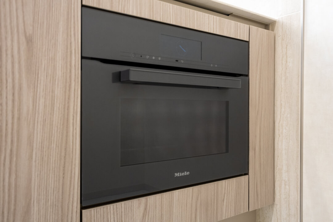 リビングダイニングが見渡せる開放的なオープンキッチン。家族やゲストと会話がしやすく、小さなお子さんがいるご家庭では子どもの姿も見守れます。手入れが簡単なIHクッキングヒーター、ミーレ製のビルトインスチームオーブン付きで設備も充実。カップボードとパントリーも設けられて、収納スペースもしっかりと確保されています。