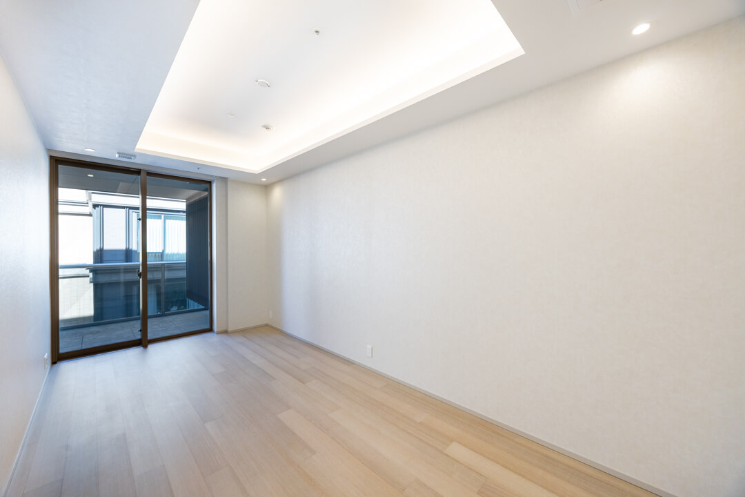 キッチンスペースを含め、約21.1帖のLDK。家族でゆったり過ごせ、ゲストも招ける広さです。折り上げ天井には間接照明が施されていて、空間をやさしい光で照らしてくれます。演出性も高まりますね。また、窓も大きく開放的。バルコニーも付いています。バルコニーからは緑も望めます。リビングの一角には収納スペースも設けられていて、日用品の整頓に便利です。