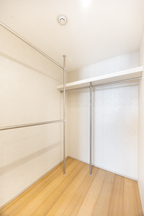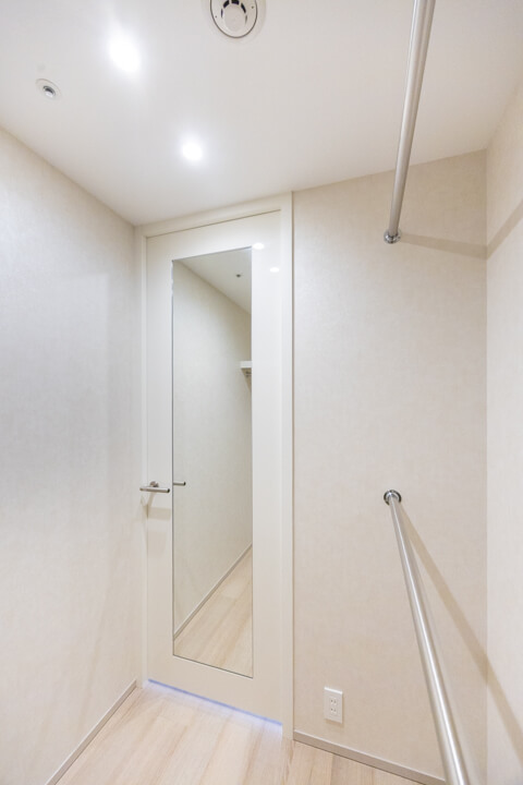 約9.5帖の主寝室。リビング同様、折り上げ天井には間接照明が施されていて空間の演出性UP。やさしい光でお部屋を包み込んでくれます。床暖房も設置されていて、冬場でも足元からじんわりあたたか。また、WIC(ウォークインクローゼット)も付いていて、洋服がたっぷりと収納できます。クローゼット内には姿見も付いています。