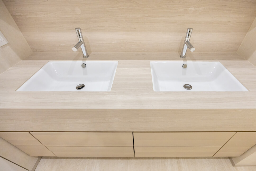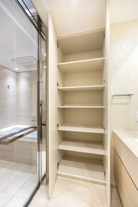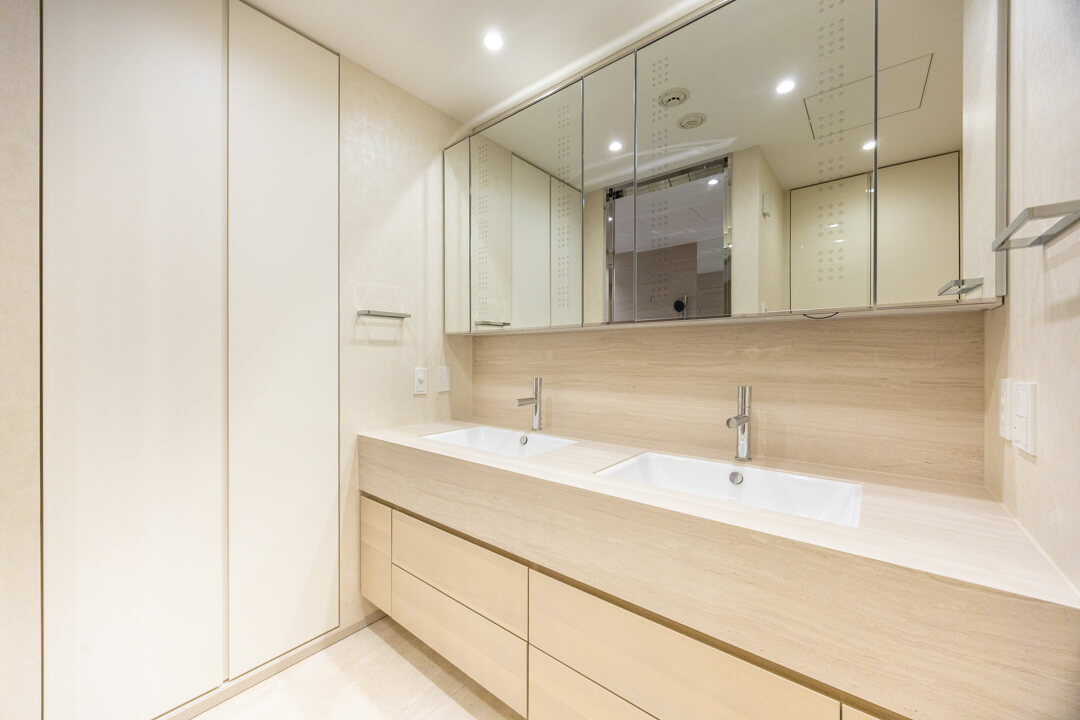 ホテルライクな2ボウルの洗面化粧台。家族で使用時間が重なっても、それぞれゆっくり使えます。洗面まわりの小物がすっきり整頓できるミラーボックスや、洗面下キャビネット付きでいつでも整った状態をキープできそうですね。別途リネン庫も設置されていて、収納スペースが充実しています。