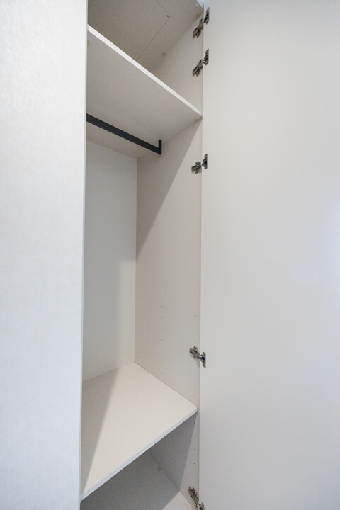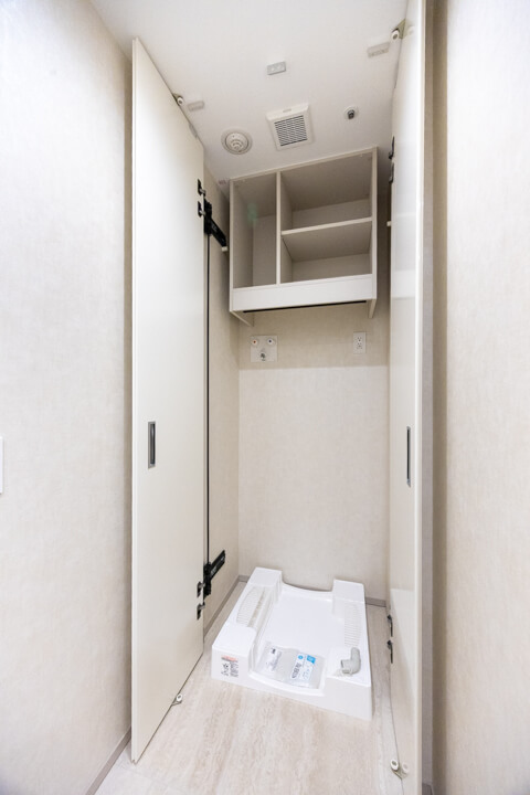 洗濯機置き場は扉付き。来客時など生活感をサッと目隠しできます。洗濯機置場の上部には収納スペースも備わっています。