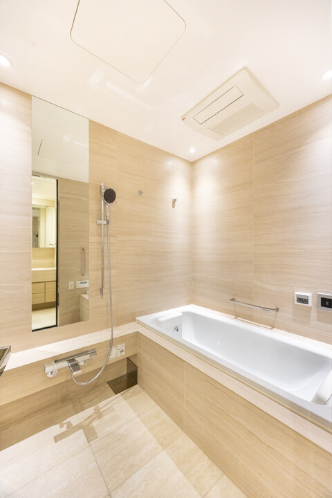 やわらかな木目デザインで上質な雰囲気のバスルーム。WELLAND社製のジェットフォームとエアブローが採用されていて、浴槽の壁面・床面から湧き上がる気泡が、身体をやさしく包み込みながら深いリラクゼーションへと導きます。追い炊き機能の他、乾燥・換気・暖房・涼風の4つの機能が備わっていて一年中快適にバスタイムが楽しめます。