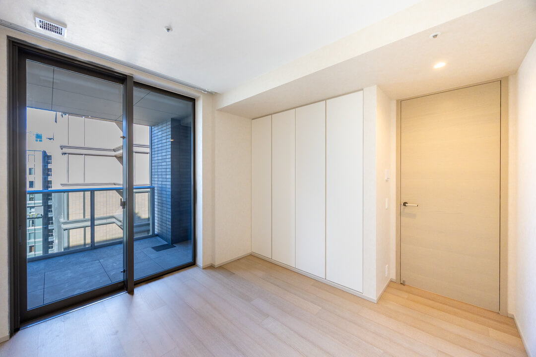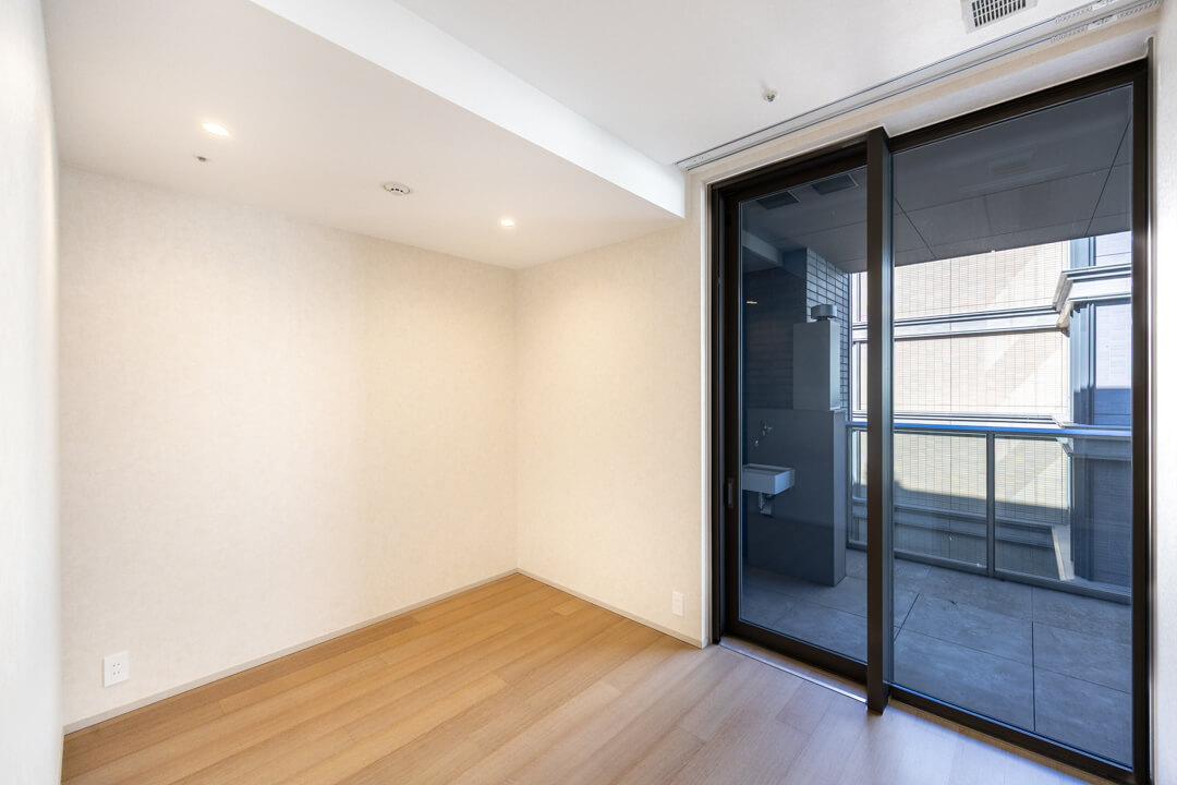 約6.5帖の洋室1。リビングダイニングから直接出入りできる動線で、家族とのコミュニケーションが取りやすくなっています。大きな窓で開放感があり、バルコニーへの出入りも可能。ビルトインエアコン、クローゼットも備わっています。また、床暖房も設置されていて、冬場でも足元からじんわり温まれます。