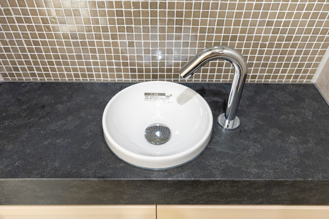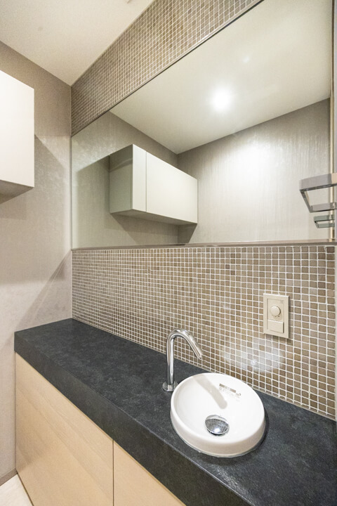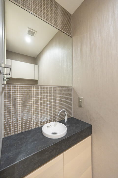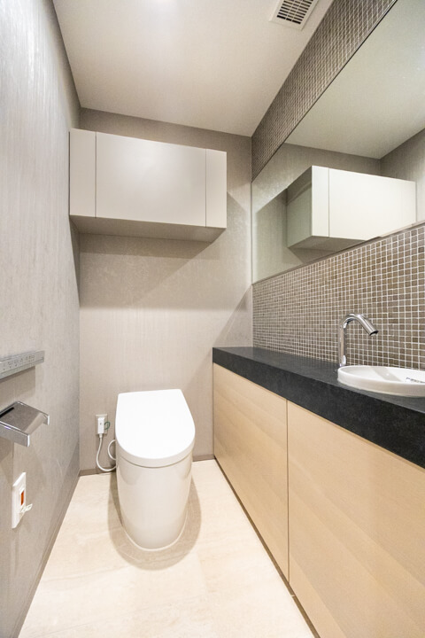 トイレは玄関と寝室側の廊下の2ヵ所に設置されています。どちらも空間がすっきり見えるタンクレストイレで、ホテルライクな手洗いカウンターも備わっています。ウォシュレットリモコンはスティック型でスタイリッシュな雰囲気。来客用、プライベート用など使い分けができそうです。