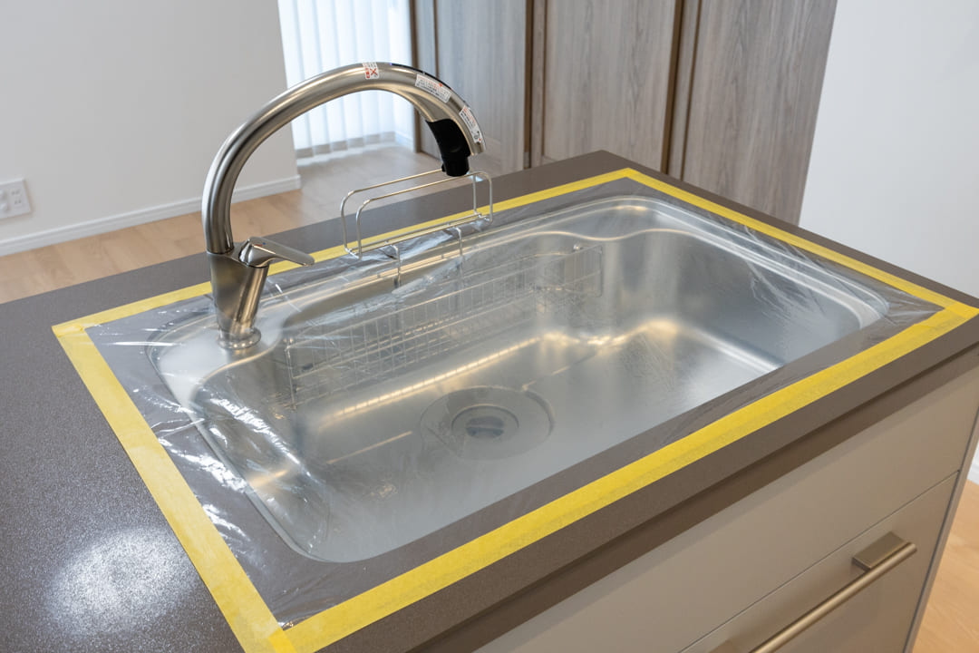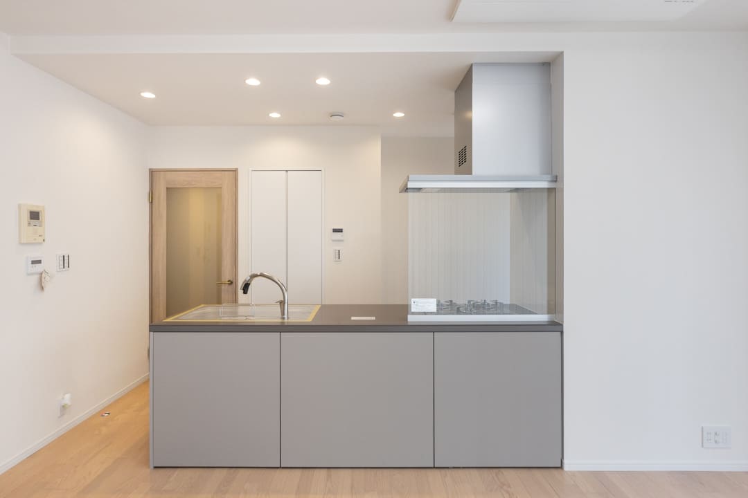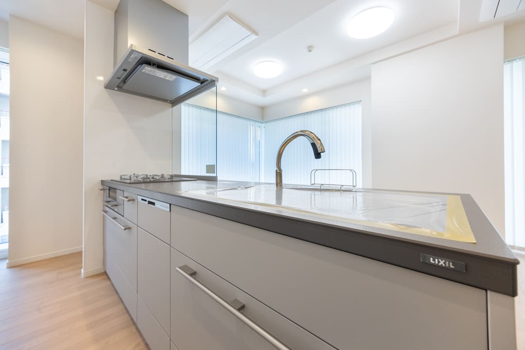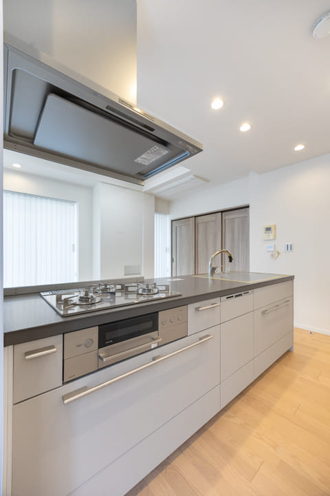 グレートーンでスタイリッシュなキッチン。リビングダイニングを見渡せる人気の対面タイプです。料理をしながらコミュニケーションが取れて、家族やゲストとの会話が弾みそうですね。コンロ前には油跳ねガードが設置されていて安心。キッチン本体の収納に加え、可動棚を備え、散らかりがちなキッチンまわりがすっきり片付きそうです。