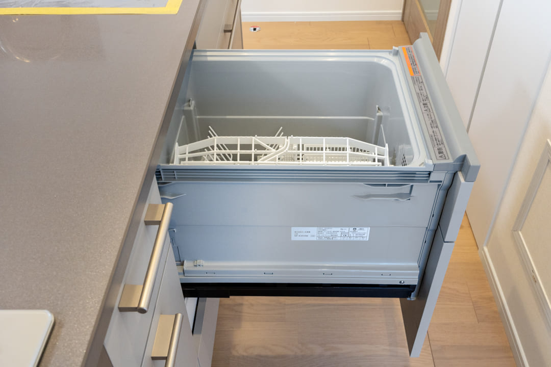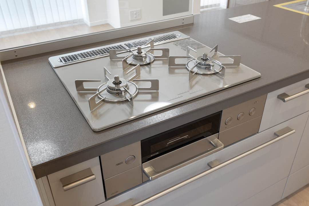 同時調理が叶うグリル付3口ガスコンロを内蔵。さらに、ディスポーザーと食洗機も完備されています。料理後すぐに生ゴミを処理できるので、悪臭の原因を防ぎ、掃除の手間を軽減。食器洗いも捗り、後片付けの時短が叶います。