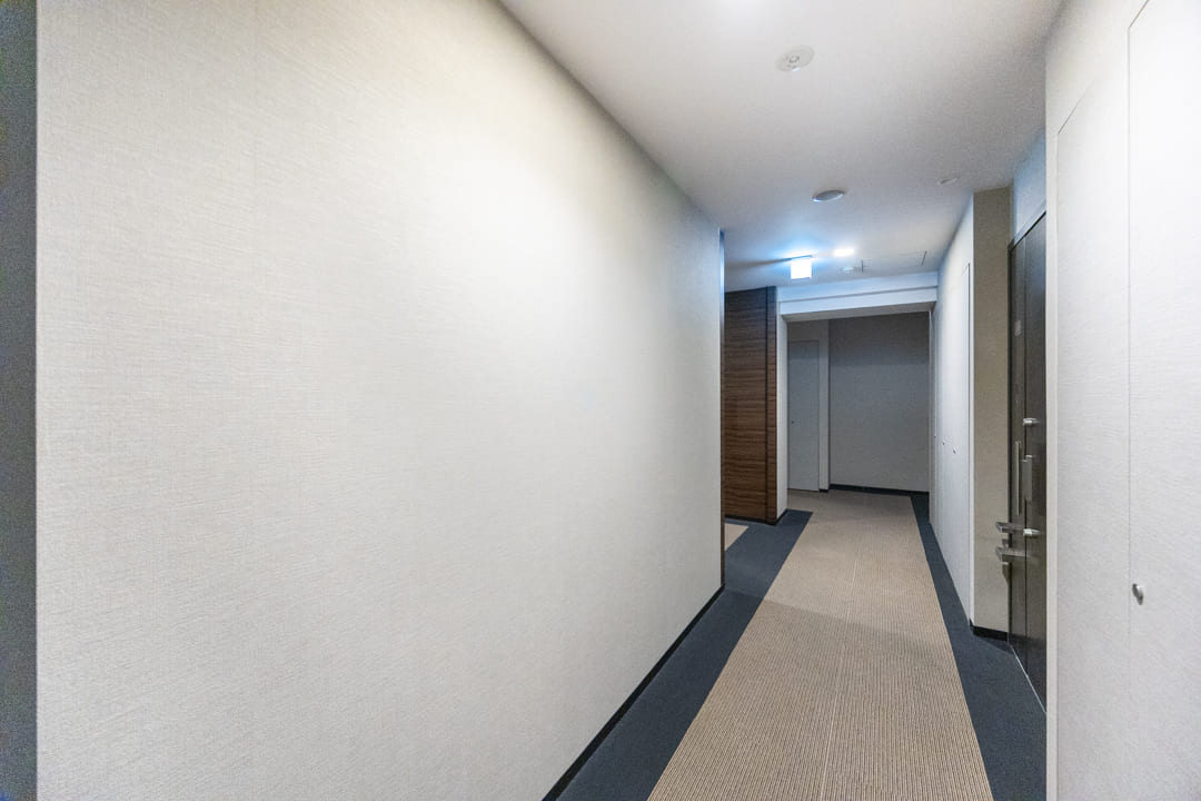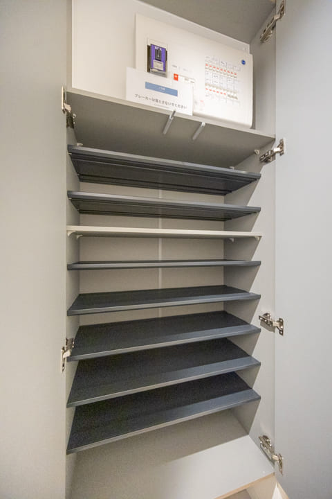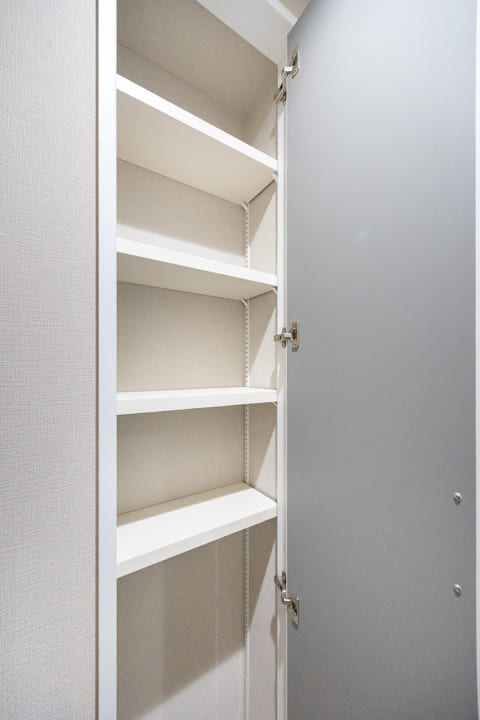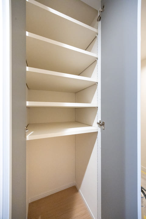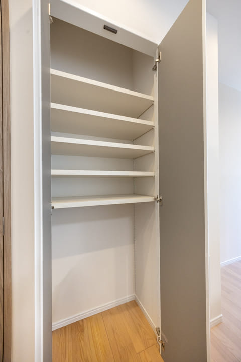 明るい内装で清潔感のある玄関。トールタイプのシューズボックスを備え、散らかりがちな靴をすっきり収納できます。廊下にも可動棚仕様の物入があり、日用品ストックやペットグッズの収納に重宝しそうです。