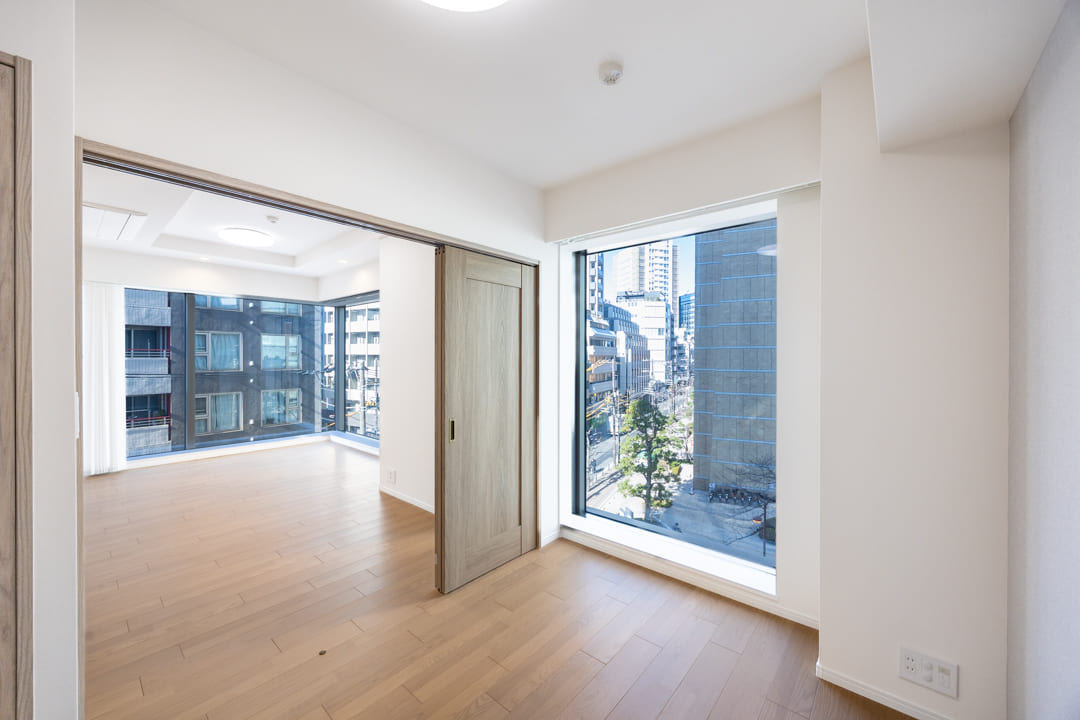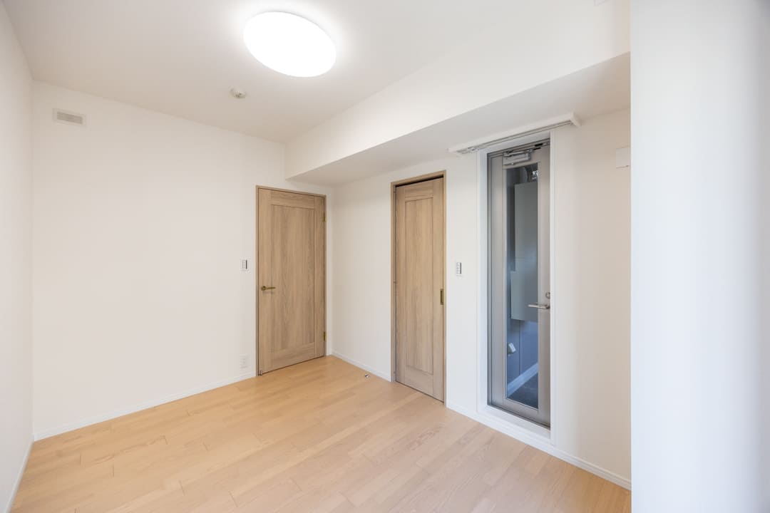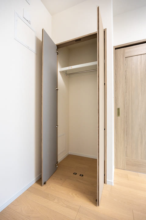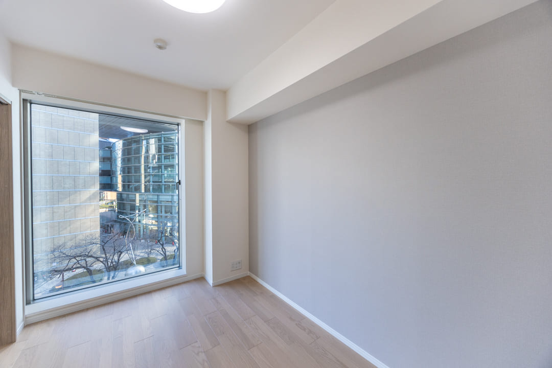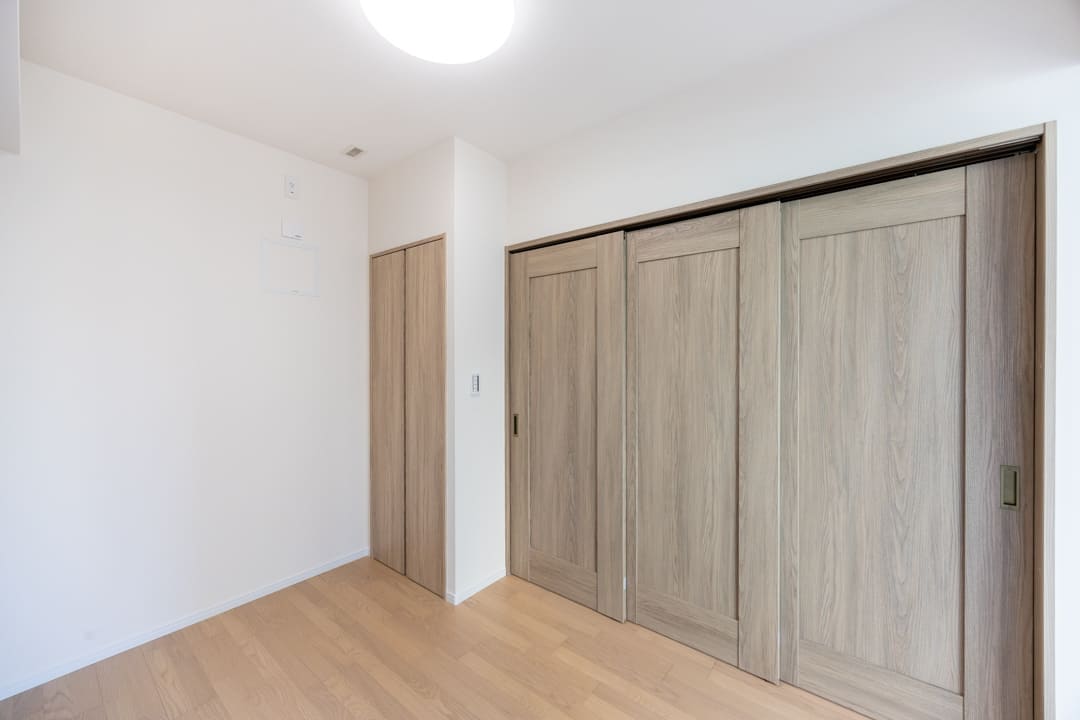 約5.3帖の洋室2。さりげないアクセントウォールが落ち着く空間を演出します。LDKとは引き戸で仕切られているので、ライフスタイルやシーンに合わせて使い分けると◎。扉を開放して拡張リビングにしたり、閉めてワークスペースやプライベート空間にしたり。フレキシブルに活用できます。クローゼット完備で収納スペースもしっかり確保されています。
