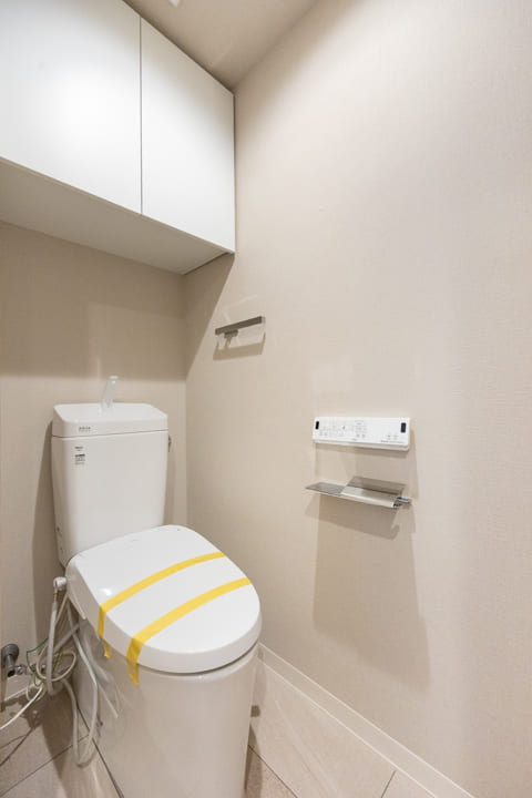 廊下に面していて独立性の高いレストルーム。LIXIL製の洗浄機能付トイレに交換済みです。背面には吊戸棚を備え、トイレットペーパーや掃除用品をすっきり収納可能。扉付きで生活感を目隠しできるのも嬉しいポイントです。