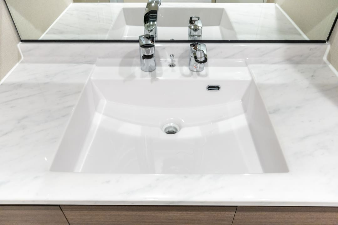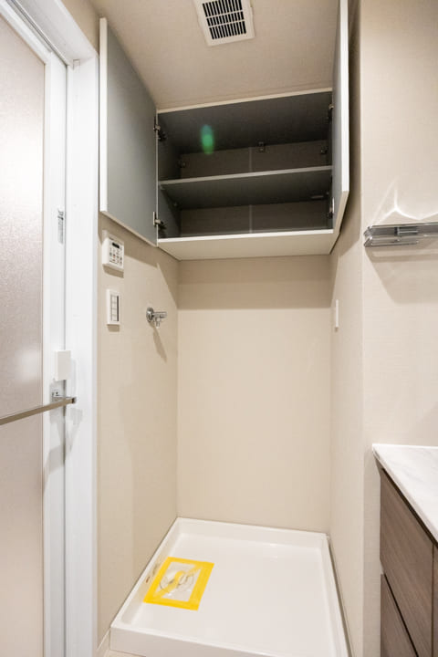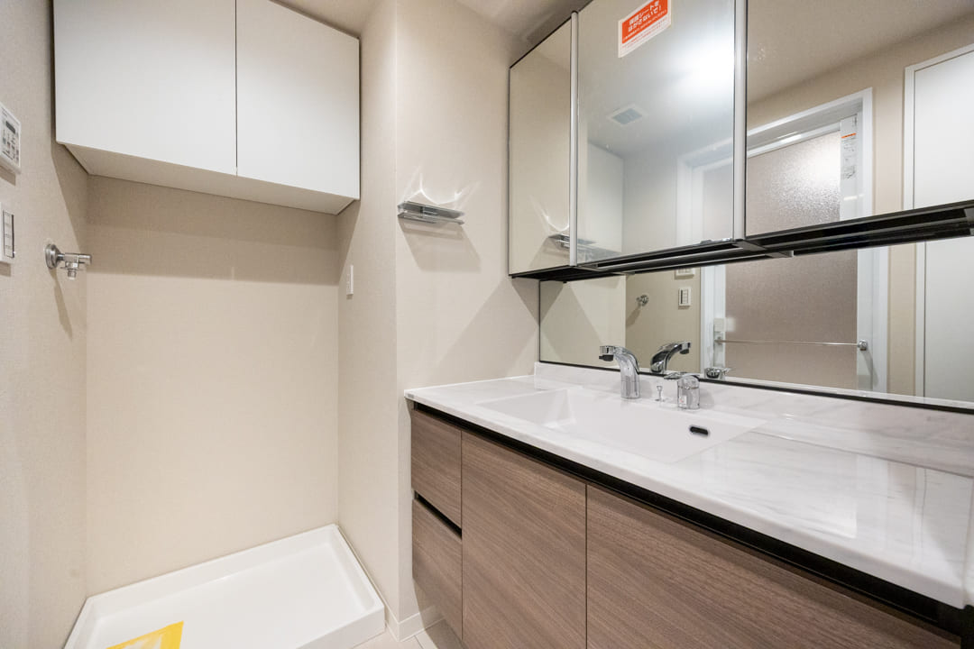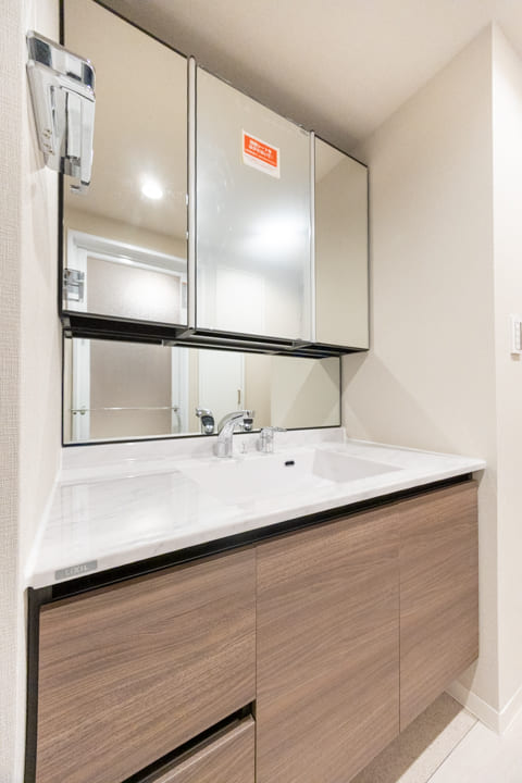 ゆとりあるカウンターを備え、使い勝手の良い洗面化粧台。化粧品やドライヤーの仮置きができ、忙しい朝の身支度も落ち着いて行うことができます。大きな三面鏡には縦2本のLED照明が配置されているので、顔に影ができにくく、お化粧時に便利。中は収納棚になっていて、洗面まわりの小物をすっきり収納可能です。リネン庫も完備されていて、いつも清潔な洗面室を保つことができます。