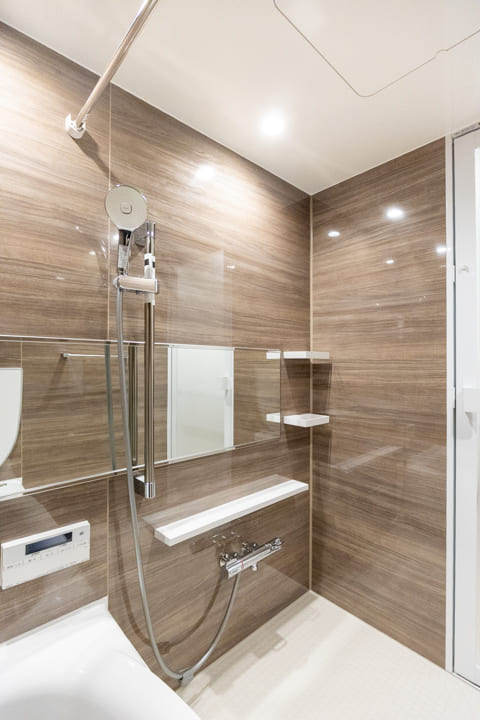 光沢のある木目柄パネルとワイドミラーが、上質な雰囲気を醸し出すバスルーム。ワイドミラーには空間を広く見せる効果も期待できます。換気・暖房・乾燥・涼風機能付きで1年中快適なバスタイムに。雨の日の洗濯スペースとしても重宝しそうです。お風呂にゆっくり浸かるのが好きという方に嬉しい追い焚き機能も搭載されています。