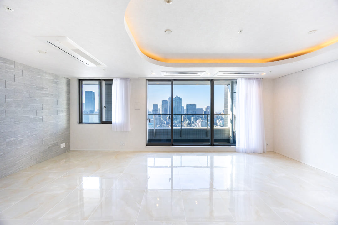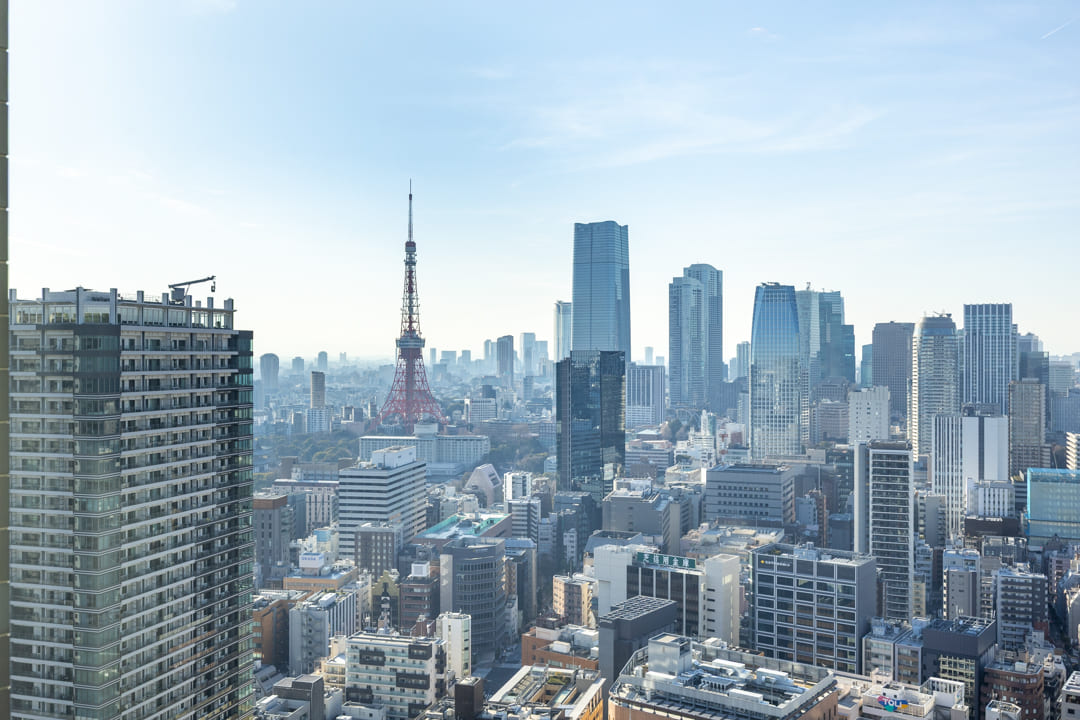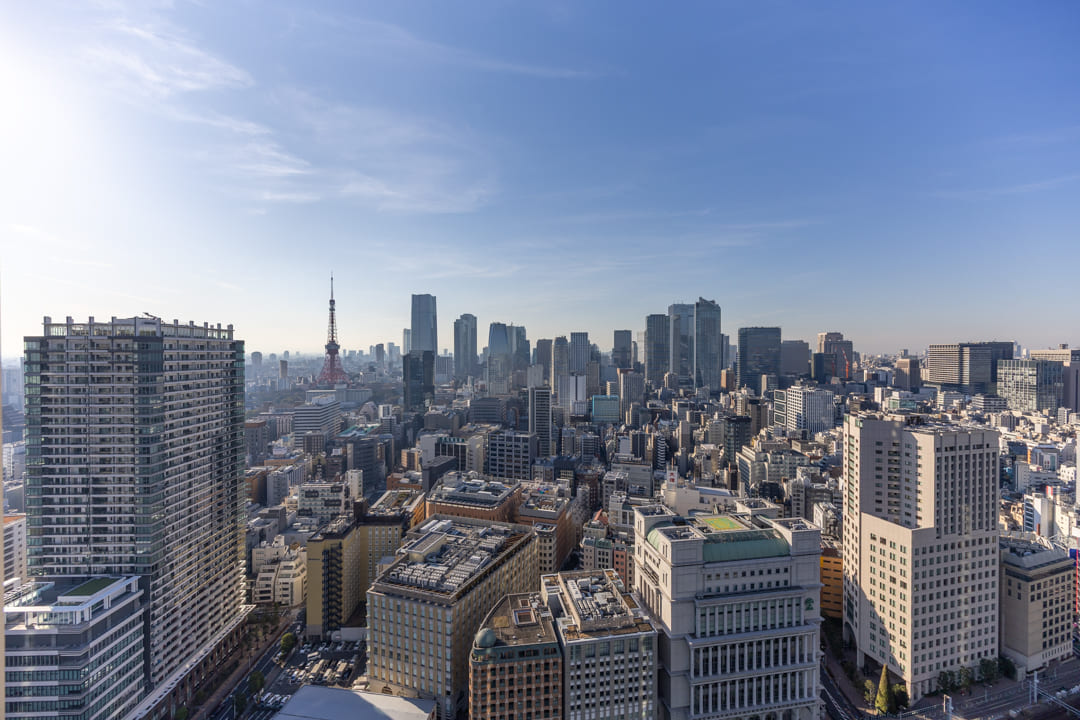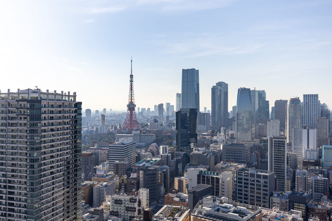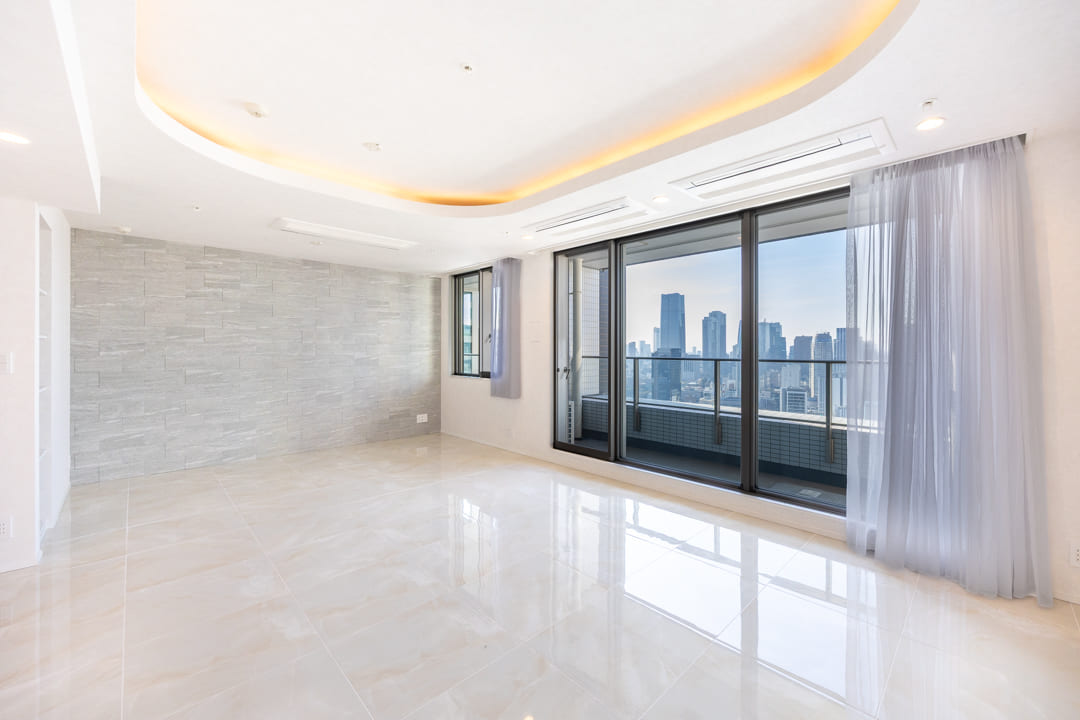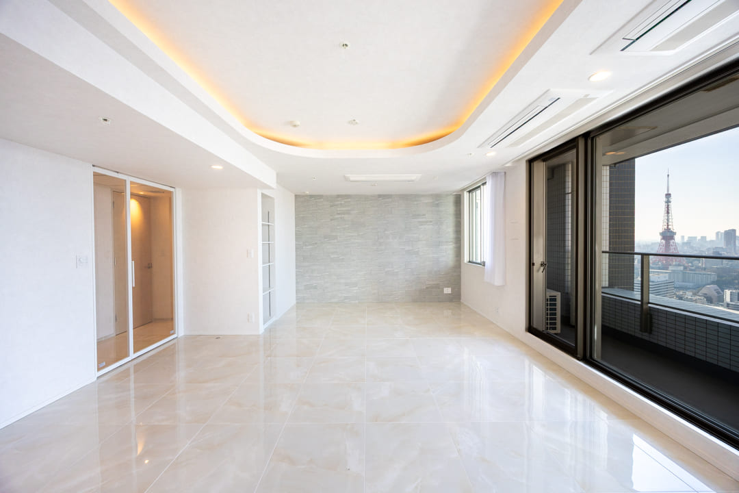 キッチンを含めて約25.0帖のゆとりあるリビングダイニング。南西向きの大きな窓からは陽光がたっぷりと差し込み、明るく伸びやかな空間が広がります。窓の先には東京タワーも見えて、都心らしい眺望が日常に特別感を添えてくれます。
