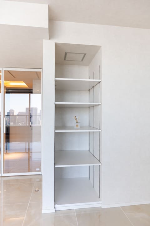 壁面には可動棚を設け、書籍やアート、小物などをディスプレイしながら収納できる仕様に。お気に入りのアイテムを飾ることで、暮らしに彩りと個性を添えられます。インテリアの一部として楽しめる、自由度の高い収納スペースです。