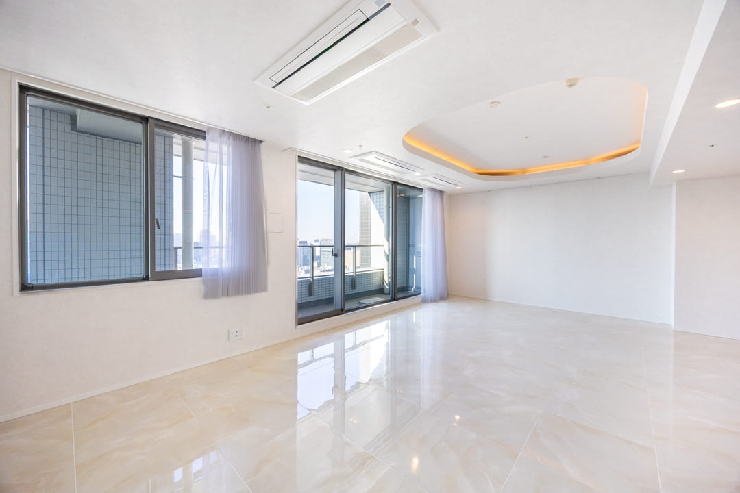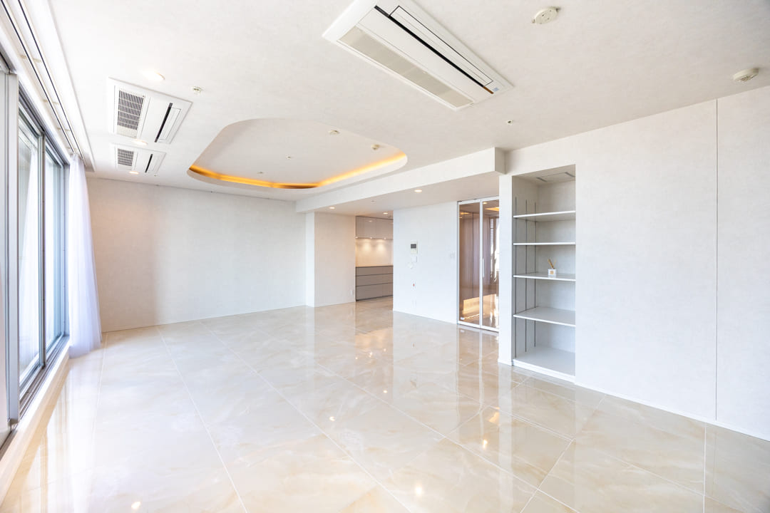 折り上げ天井に配した間接照明が、空間にやわらかな陰影を与え、落ち着きのある雰囲気を演出。光沢のあるフロアは自然光を美しく反射し、明るさと開放感を高めてくれます。石調のアクセントウォールが程よい存在感を添え、シンプルな中にも表情のある、上品でまとまりのあるリビング空間に仕上がっています。
