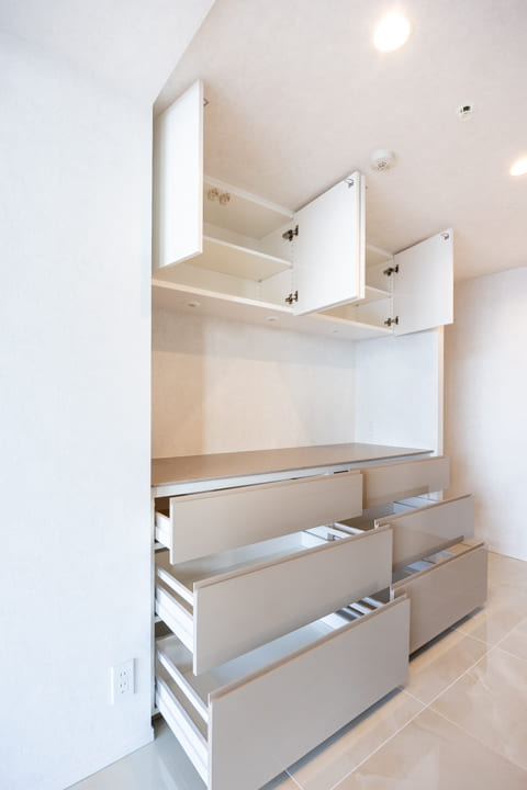 背面には収納力のあるカップボードを設置。キッチンと同デザインで統一感のある仕上がりに。食料品のストックや食器類を整理しやすく、すっきりとした空間を保つことができます。カウンターにはコンセントを備え、炊飯器やコーヒーメーカーなどの家電使用にも便利な仕様です。