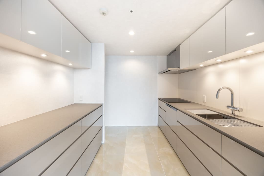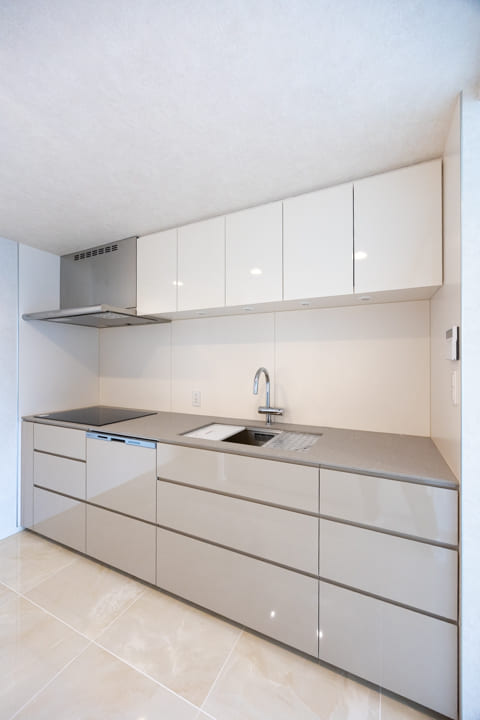独立性が高く、落ち着いて作業に取り組めるキッチンスペース。生活感が出やすいキッチンまわりをさりげなく目隠しでき、においが居住空間へ広がりにくい点も魅力です。グレートーンを基調としたデザインが、空間にほどよい引き締めと上品な印象を与えています。