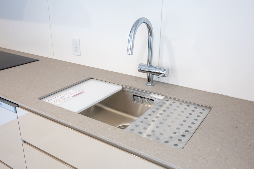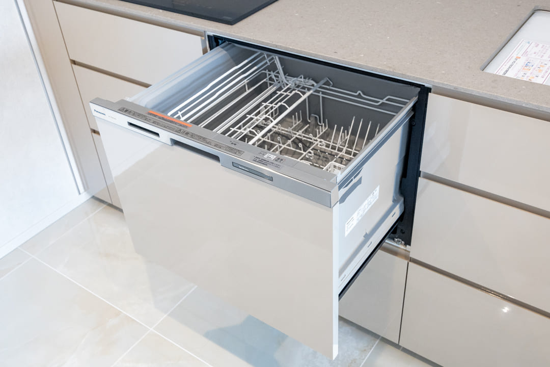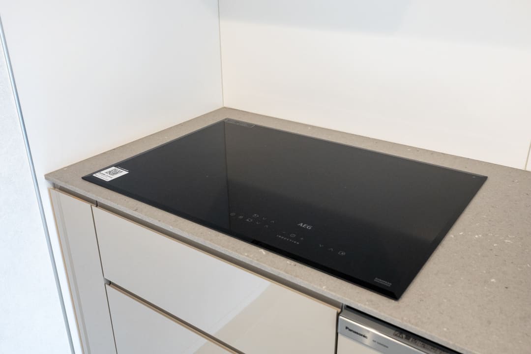 AEG製の3口IHクッキングヒーターを採用。凹凸のないフラットな天板で、汚れを拭き取りやすく、日々のお手入れもスムーズです。さらに食洗機を内蔵し、後片付けの負担を軽減。調理から片付けまで、効率的なキッチンワークをサポートします。