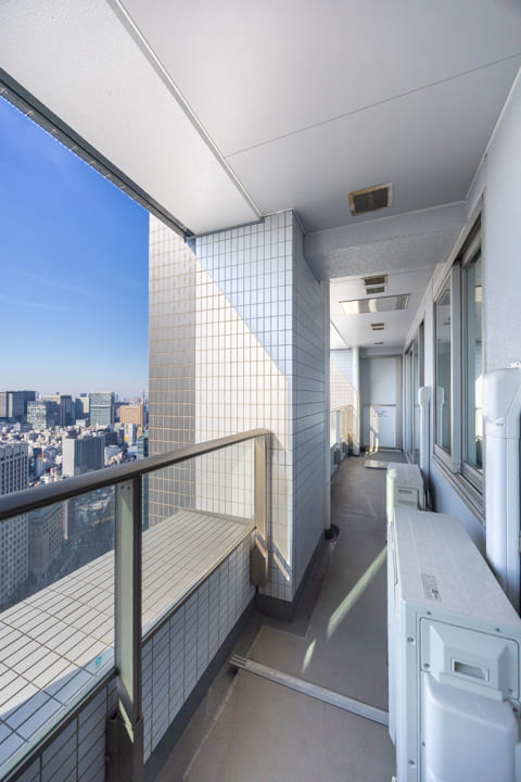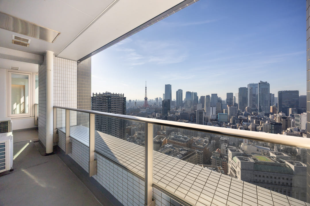 LDKと洋室2に跨る、11.43㎡のゆとりあるバルコニー。38階南西向きにつき、日当たり・眺望ともに良好です。午後のやわらかな陽光が差し込み、都心にいながらも伸びやかな開放感を味わえます。西側には東京タワーを望み、煌めく都会の景色を日常のワンシーンとしてお楽しみいただけます。