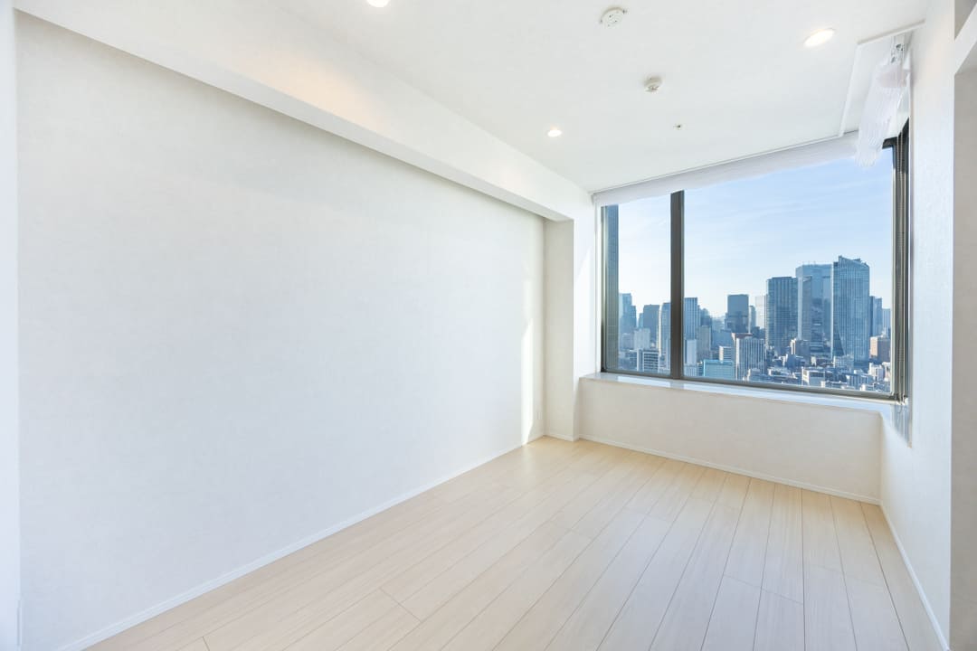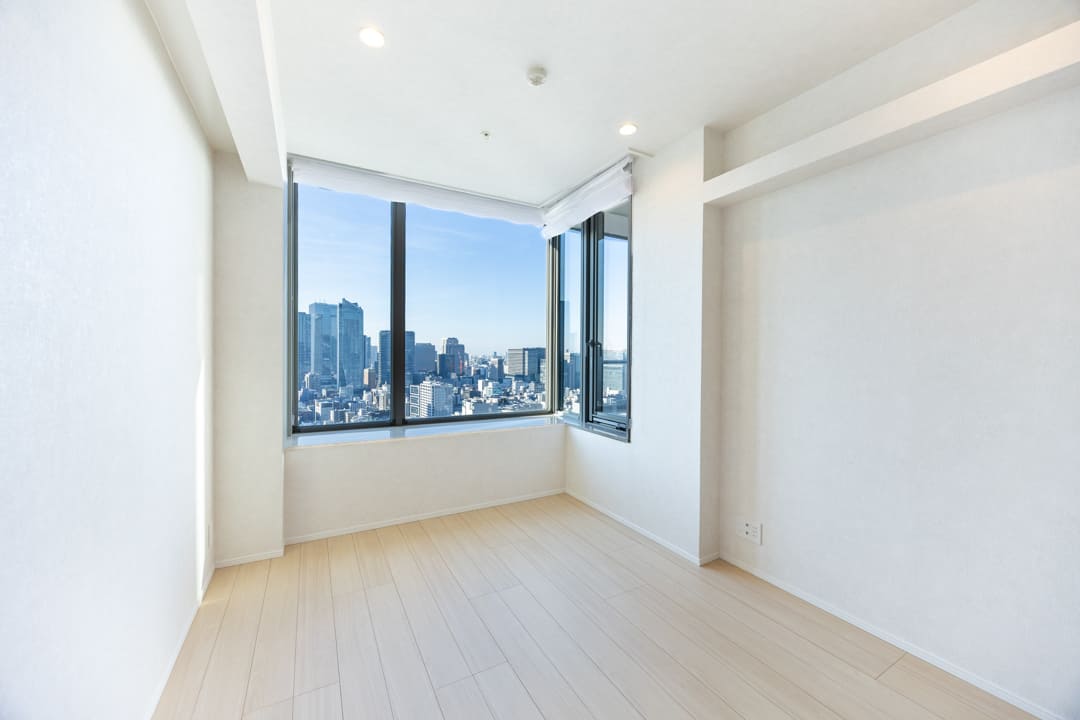 ゆったり過ごせる約10.2帖の洋室1。大開口のL字窓からは、青空と東京タワーを望む開放的な眺めが広がります。間接照明のやわらかな光が空間を包み込み、リラックスした時間を演出。落ち着きあるプライベートルームです。