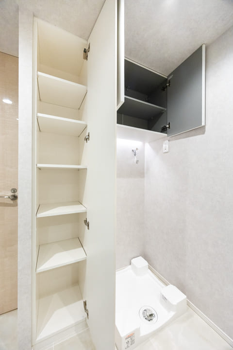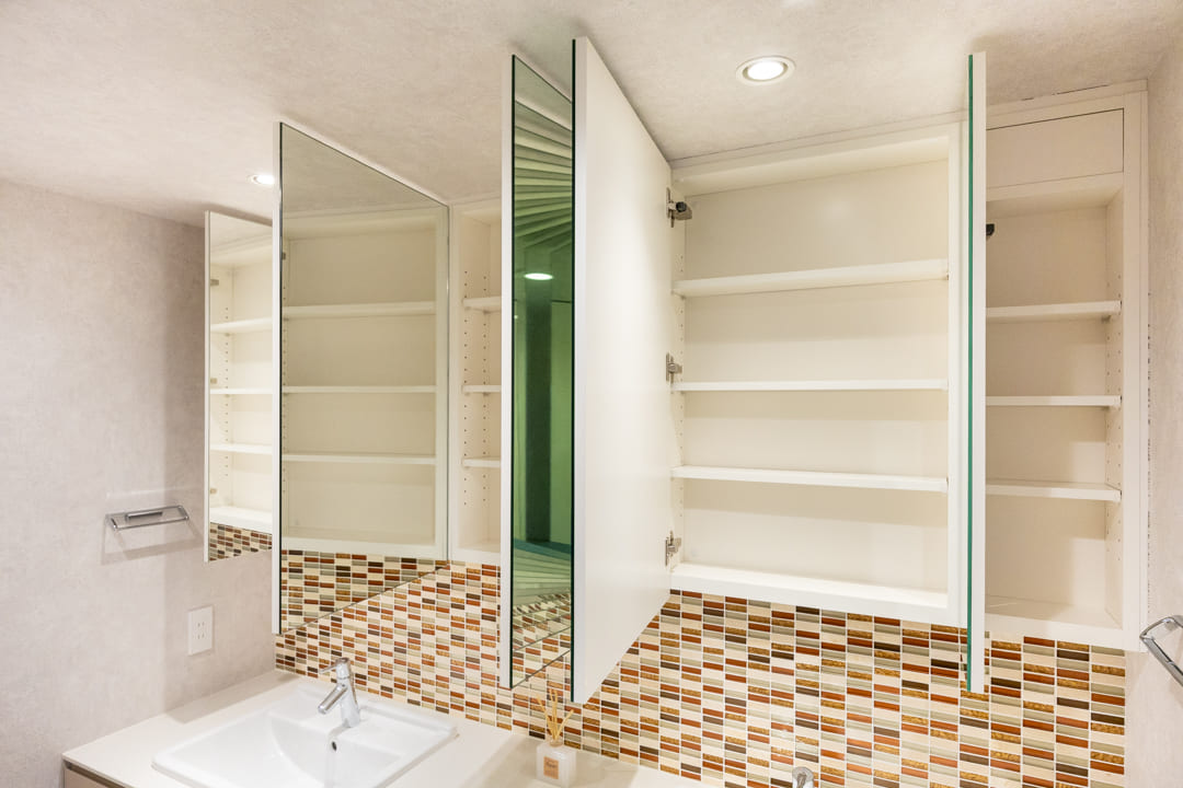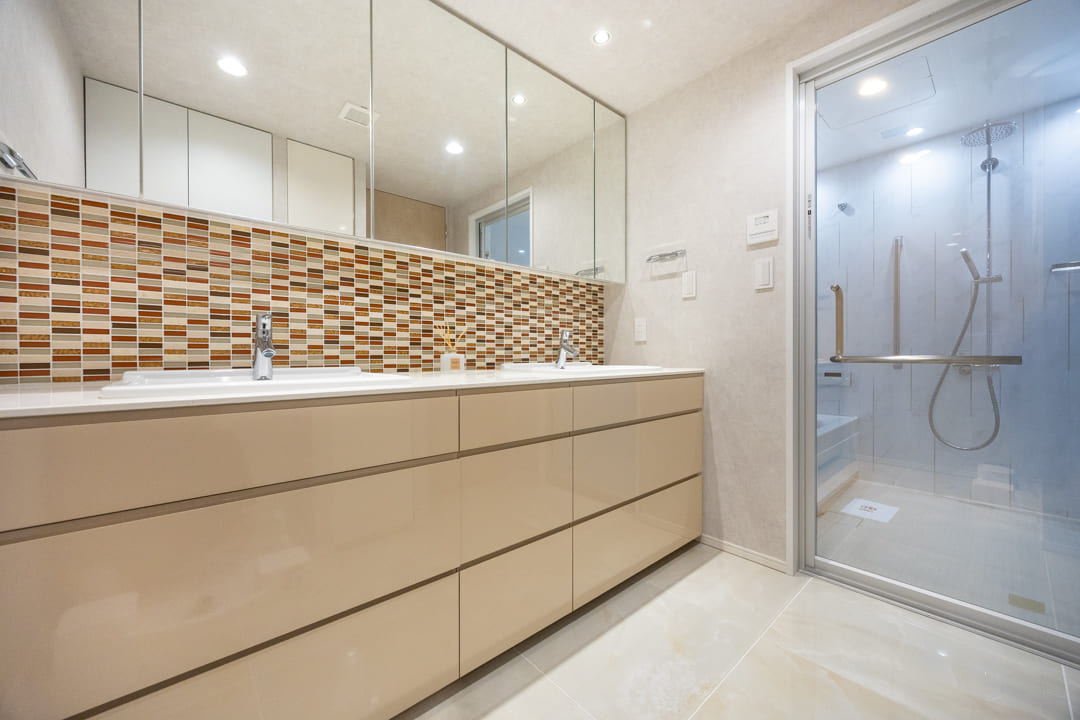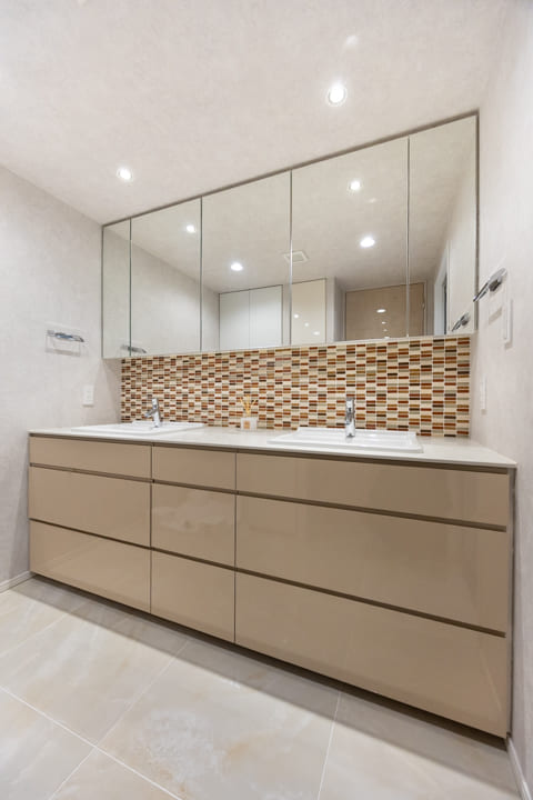 モザイクタイルが上品なアクセントを添える洗面化粧台。ゆとりある2ボウル仕様で、2人同時の使用もスムーズに行え、忙しい朝の身支度にもゆとりが生まれます。広々としたカウンターは、化粧品やドライヤーの仮置きにも便利。洗面まわりの小物はミラーボックスに収納でき、カウンター上をすっきりと保てます。さらにリネン庫を備え、タオルや日用品を機能的に整理できるのも嬉しいポイントです。