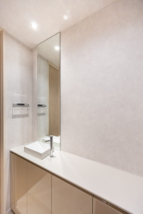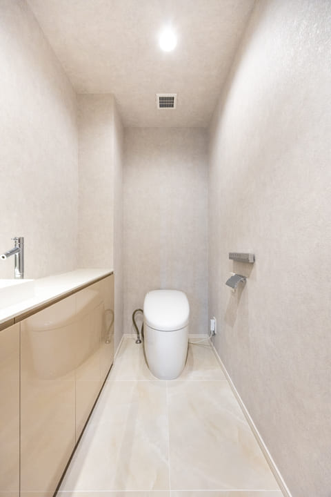 廊下に面していて独立性の高いレストルーム。TOTO製の洗浄機能付トイレを採用しています。丸みを帯びたタンクレス仕様でスタイリッシュな印象。広々とした手洗いカウンターで、すぐに手を洗うことができます。ゲストを洗面室まで案内する手間がかからないのも嬉しいですね。