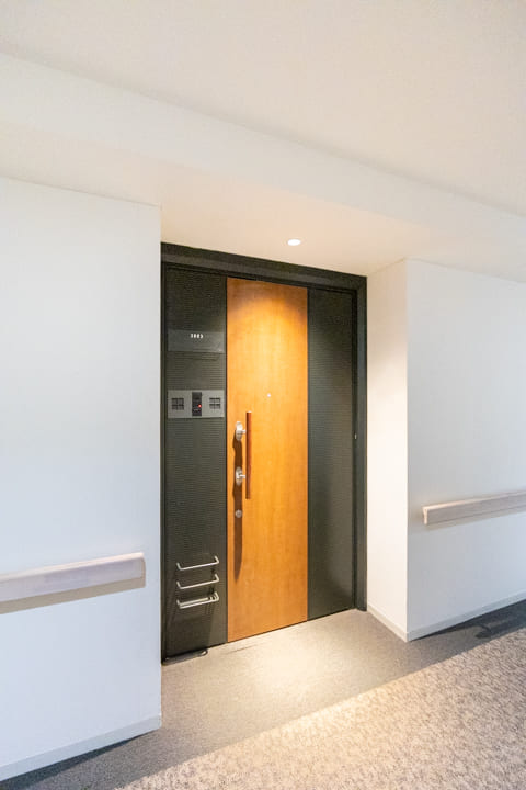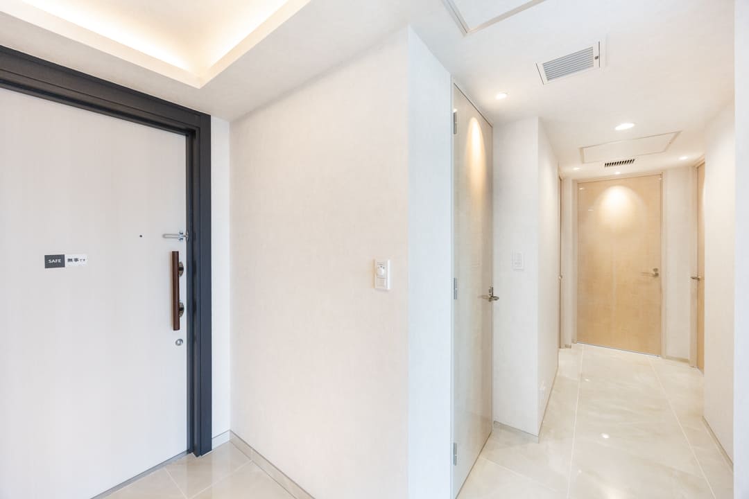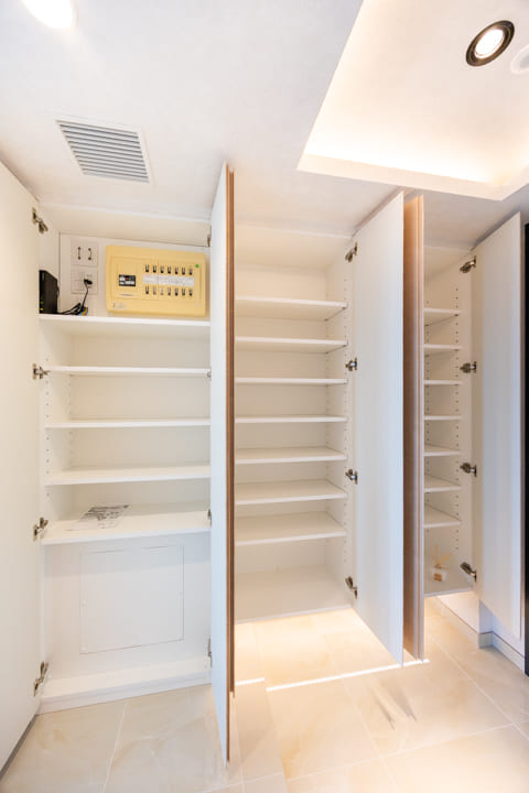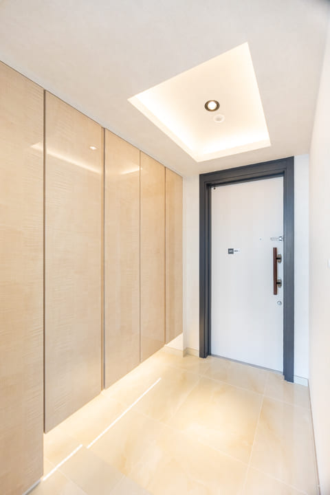 折り上げ天井の間接照明とタイルフロアが、ホテルライクな雰囲気を演出する玄関。上質な第一印象が、住まいへの期待感を高めます。大容量のシューズボックスを備え、すっきりとした空間を保ちやすいのも魅力。廊下にも物入があり、日用品ストックやペットグッズの収納に重宝しそうです。