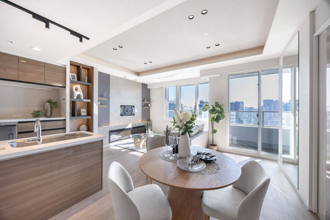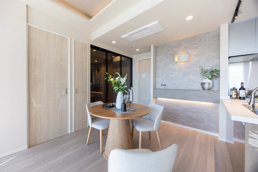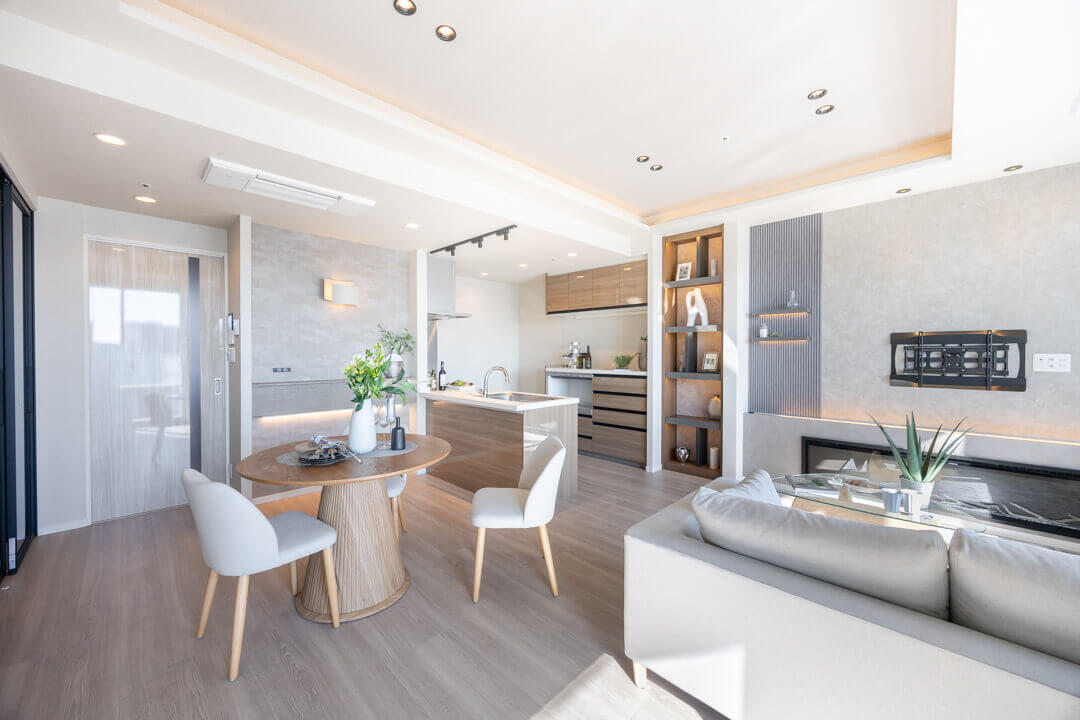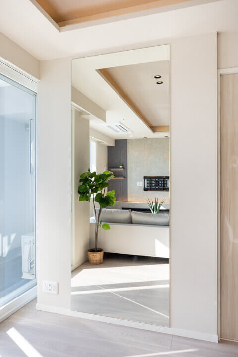 キッチンスペースを含め、約18.1帖のLDK。家族でゆったり過ごせる広さです。自然な光が入る南向きで、窓面積が広く開放感もたっぷり。27階部の高層階につき、室内からの眺望も良好です。天井には間接照明が施されていて、やさしい光で空間を包み込んでくれます。リビングの一部にミラーが付いていて空間をより開放的に見せてくれます。