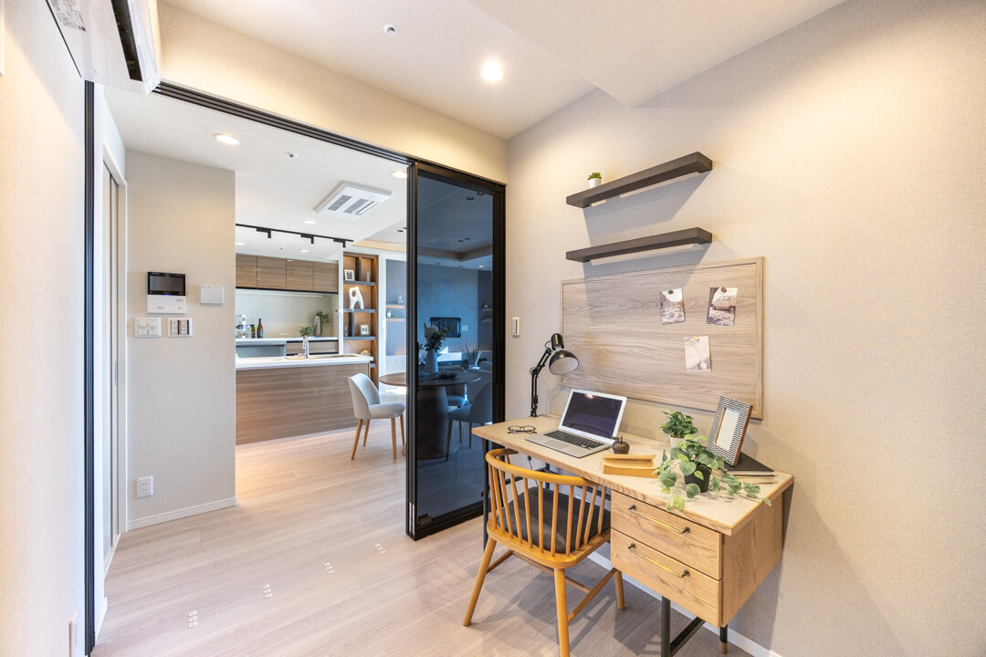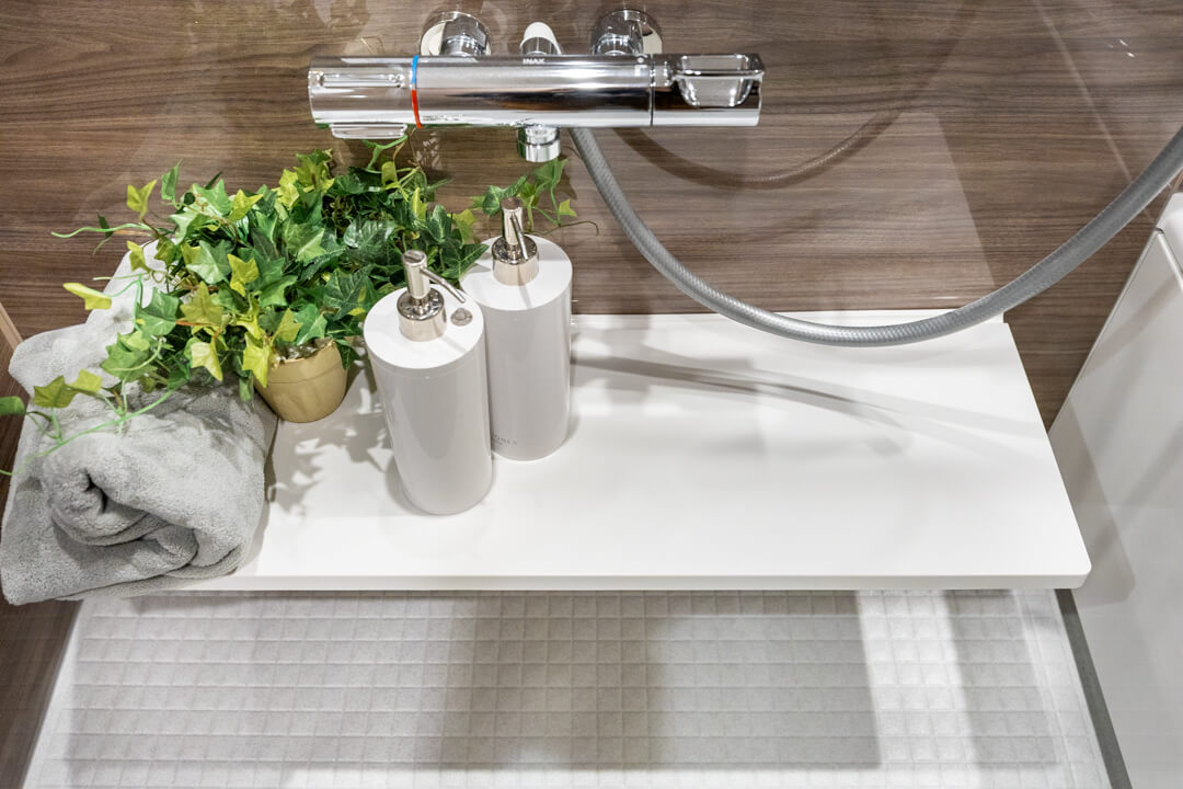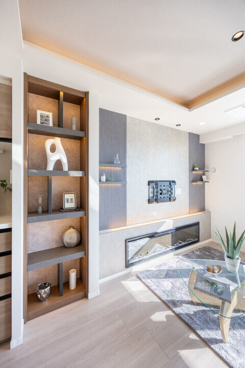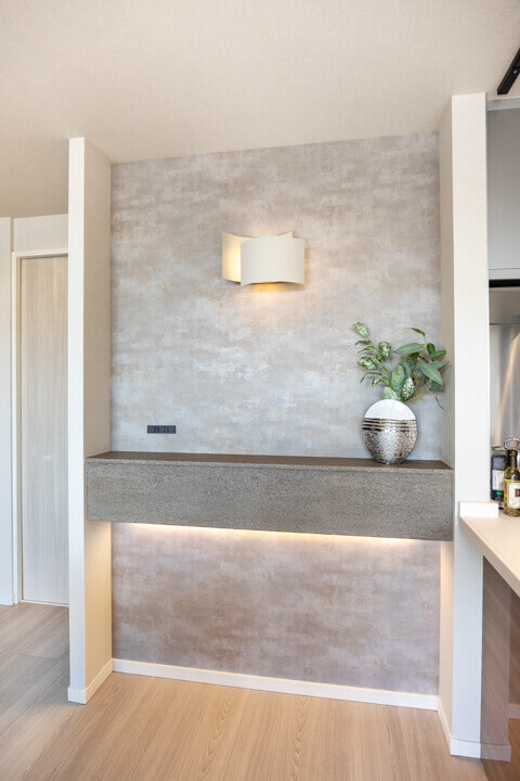 アートや植物を飾れるカウンターや、間接照明付のお洒落な飾り棚が設けられていて、空間に彩りをプラスできます。