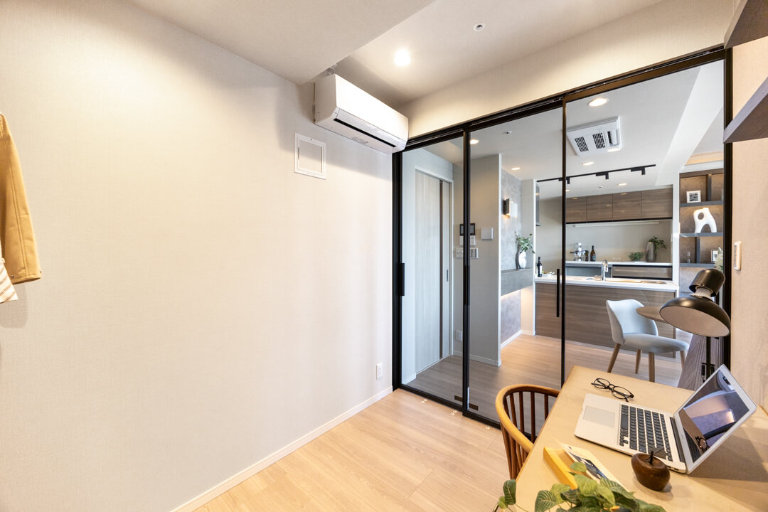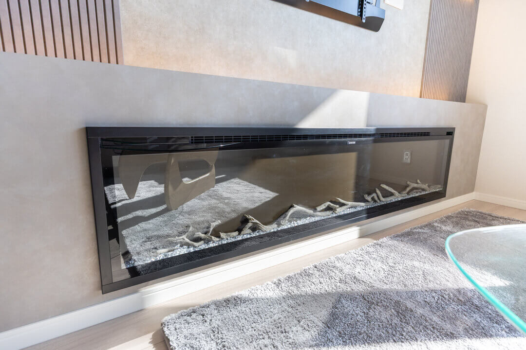 テレビボード下には壁埋め込み型の電気式暖炉が設置されています。手軽さや安全性が魅力で、炎の視覚効果もありインテリアの一部としても◎。また、床暖房も設置されていて、冬場でも足元からじんわりと温まれます。床に直接座ったり、寝転んでもひんやり感なく暖かく過ごせます。ビルトインエアコンも2基付いていて、室内の温度調整もスムーズに行えます。