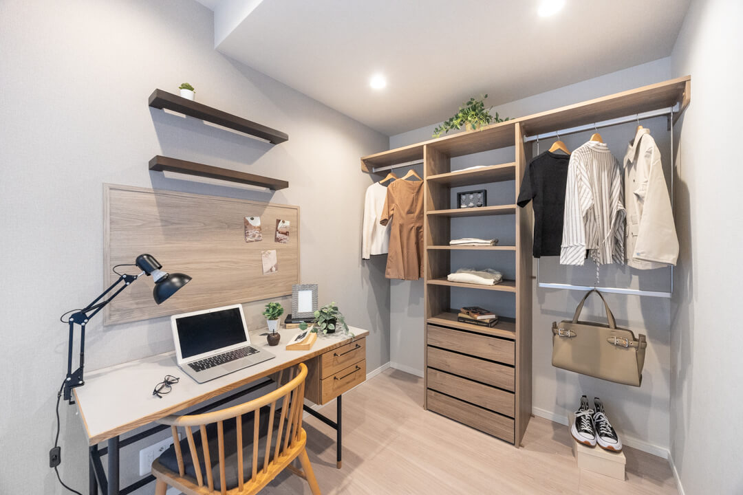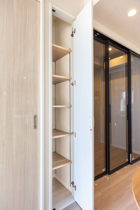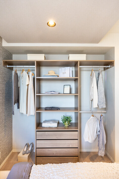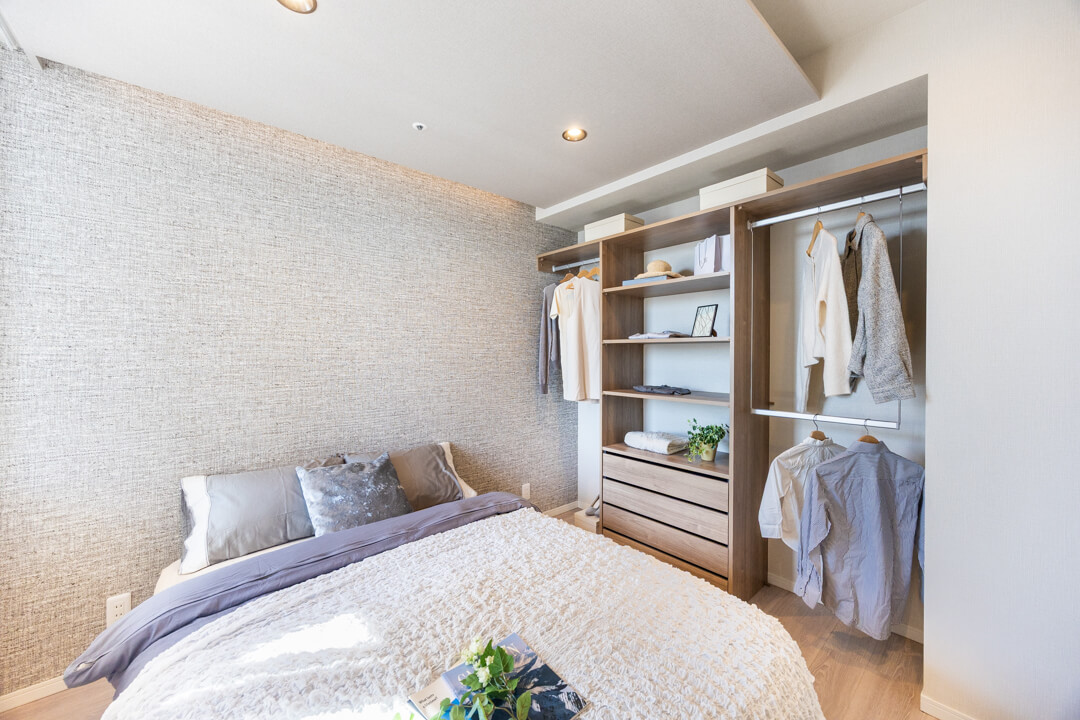 リビングと隣接した約3.5帖の洋室。扉の開口部が広く開放的に過ごせます。床にドアレールがないので見た目もすっきりとした印象です。こちらにもオープンクローゼットを完備。可動棚と引き出し収納も備わっています。
