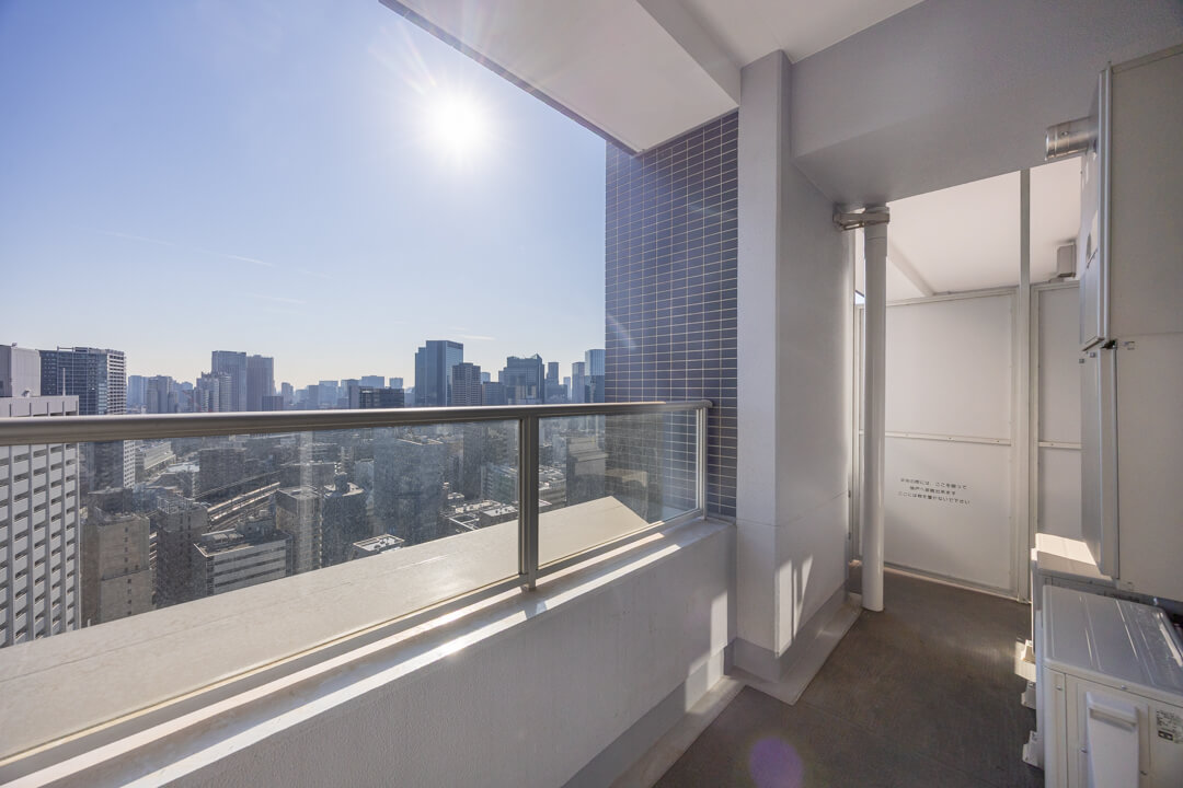 リビングダイニングと洋室1に面したバルコニー。7.3㎡ほどの広さです。南向きで陽当り良好、手すりの上部が透明になっていて開放感も感じられます。27階部の高層階につき眺望良好。都心のビル群が望めます。