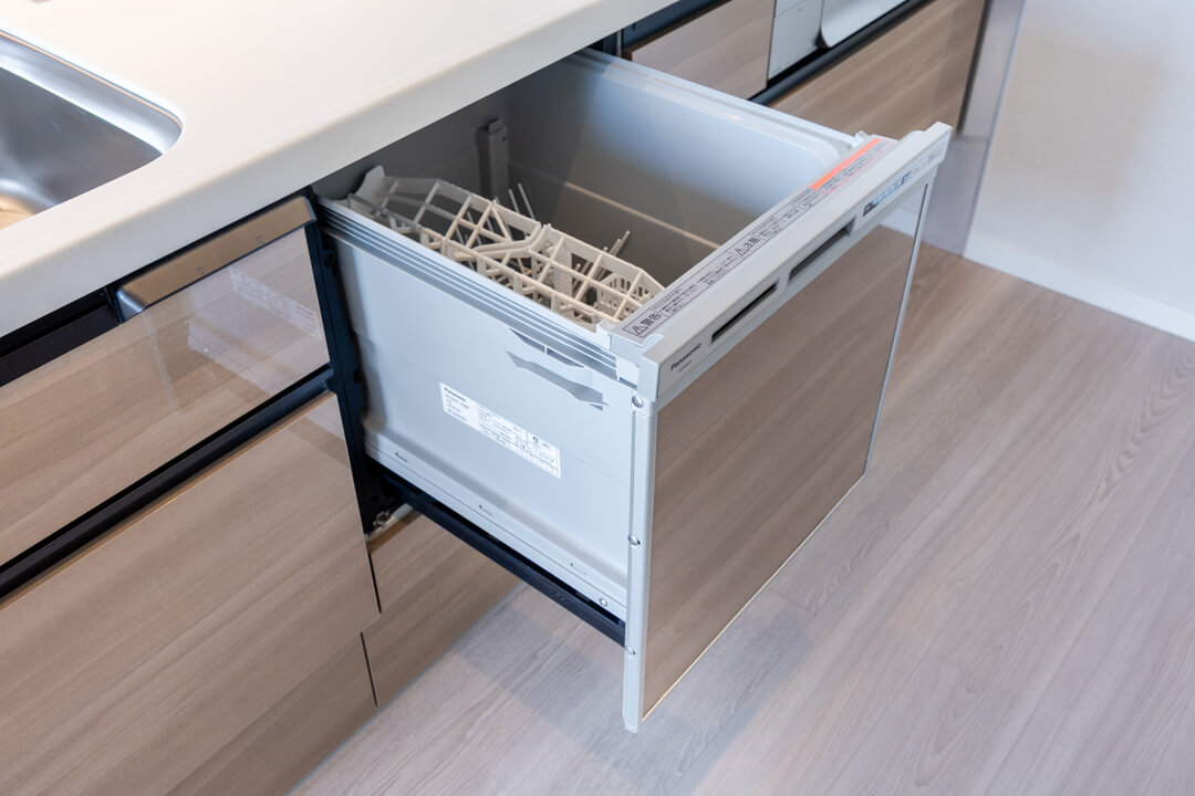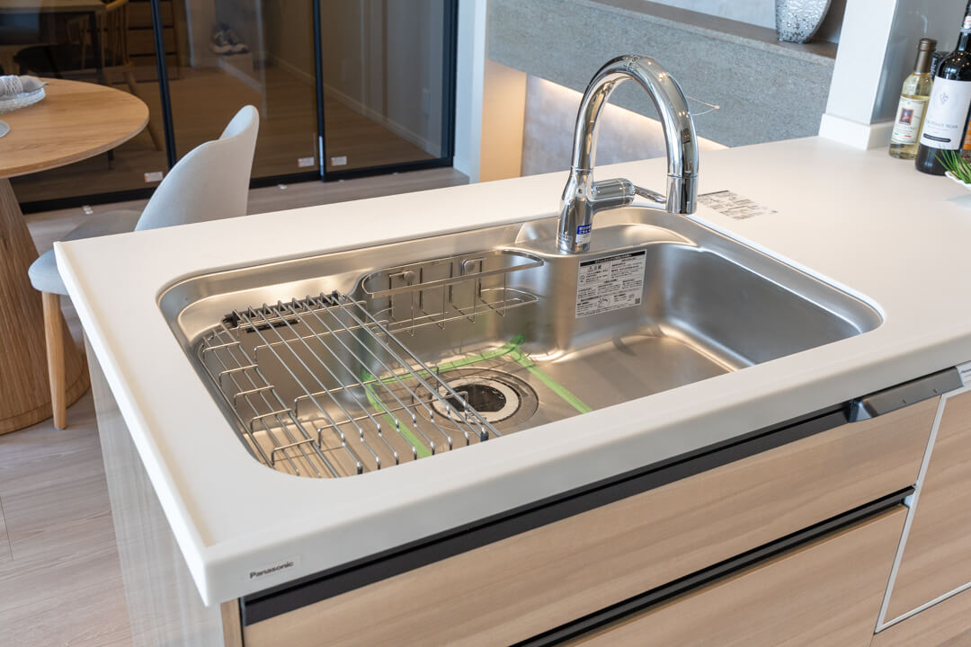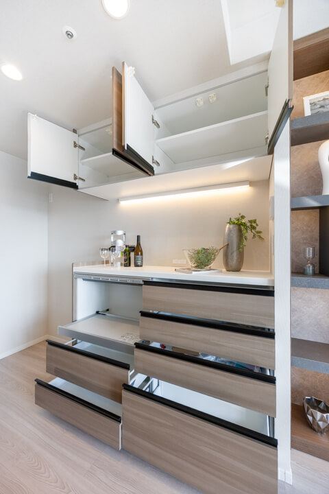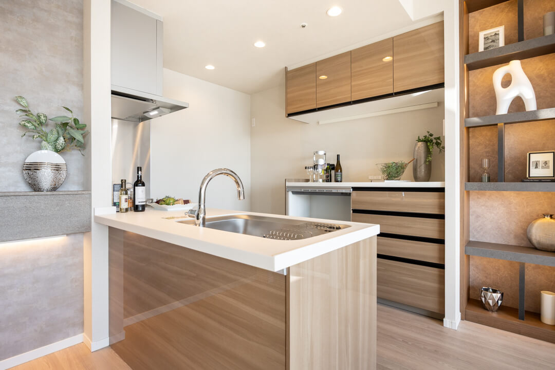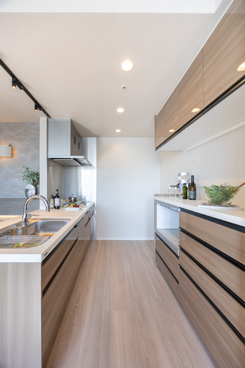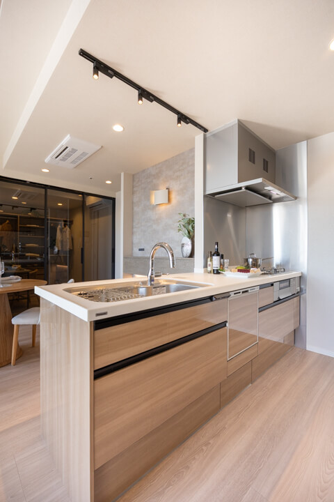 家族やゲストとコミュニケーションが取りやすい対面型のシステムキッチン。小さなお子さんがいるご家庭では子どもの姿も見守れます。料理が捗る3口ガスコンロ、家事の時短に心強い食洗機、生ゴミの処理に便利なディスポーザー付きで設備も充実。カップボード付きで収納スペースもしっかりと確保されています。
