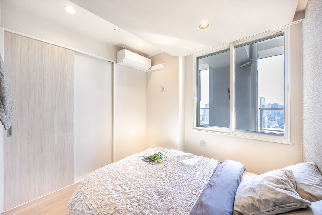 約5.4帖の洋室1。自然な光が入る南向きで、窓はバルコニーに面しています。オープンクローゼット付きで、可動棚や引き出し収納も備わっています。