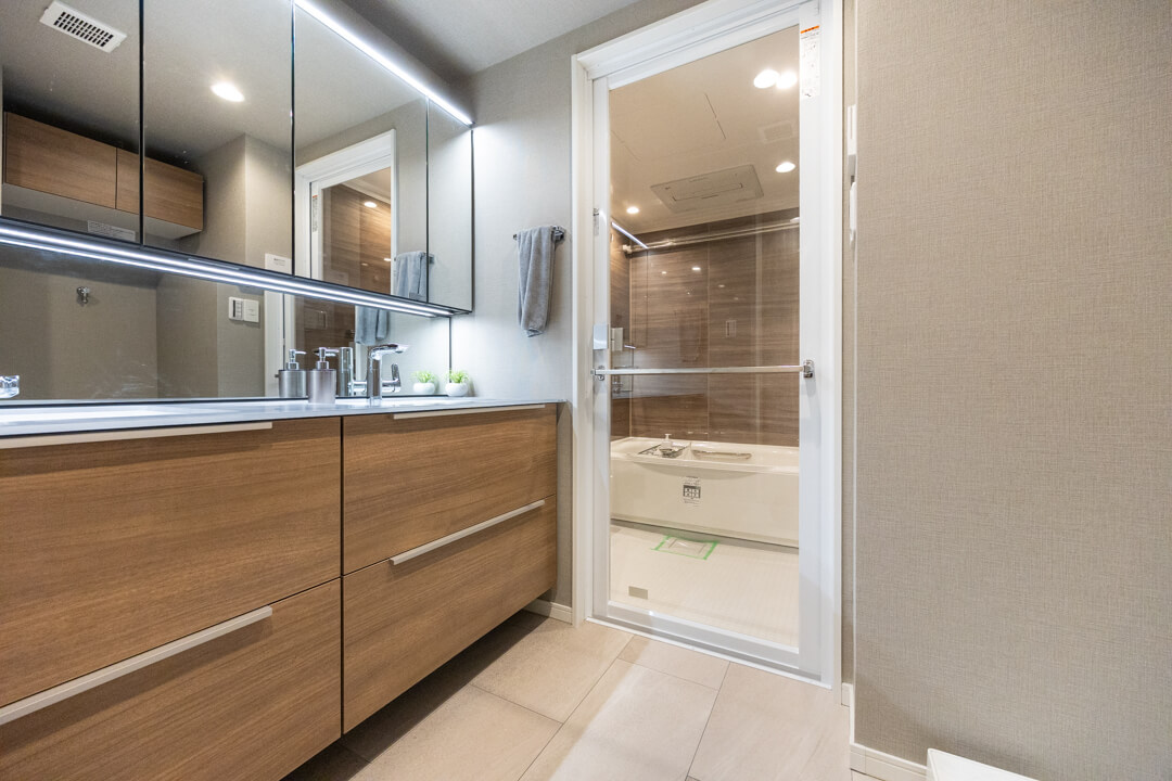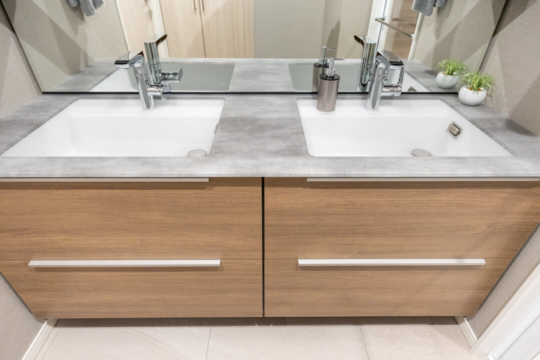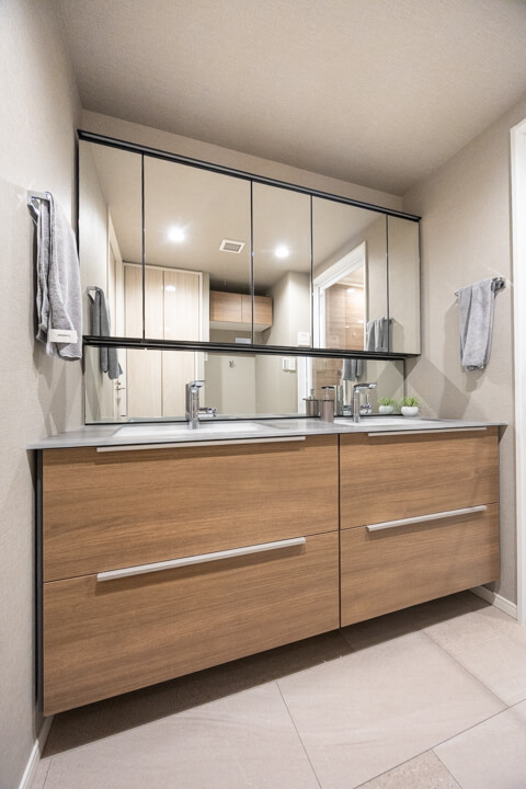 ホテルライクな2ボウルの洗面化粧台。家族で使用時間が重なっても、それぞれゆっくリ使えます。洗面まわりの小物がすっきり整頓できるミラーボックスや、モノの出し入れがしやすい引き出し式のキャビネット付きで使い勝手の良さもポイント。リネン庫付きで収納スペースもしっかりと確保されています。