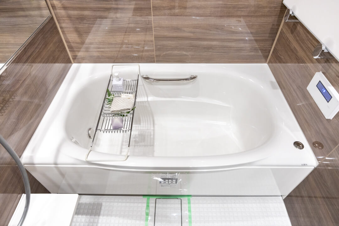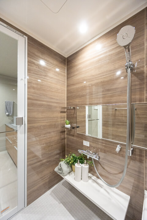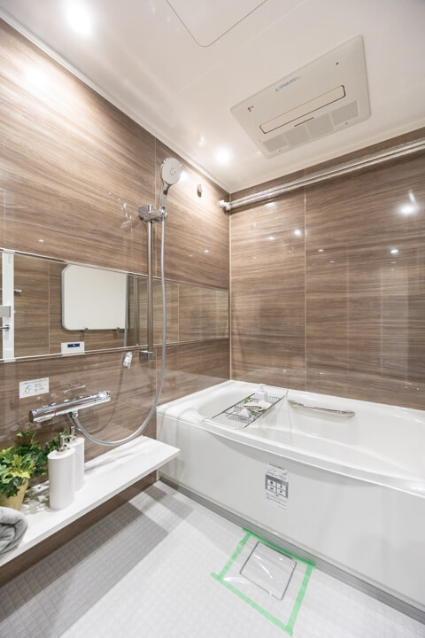 ウッド調であたたかみのある雰囲気のバスルーム。1418サイズです。追い炊き機能の他、乾燥・換気・暖房・涼風の4つの機能が備わっていて、一年中快適にバスタイムが楽しめます。ランドリーパイプ付きも2本付いていて、雨の日や冬場の洗濯にも困りません。