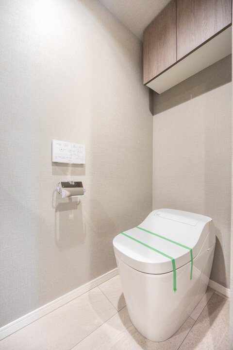 廊下に面したレストルーム。空間がすっきり見えるタンクレストイレです。ホテルライクな手洗いカウンター、ウォシュレットも備わっています。