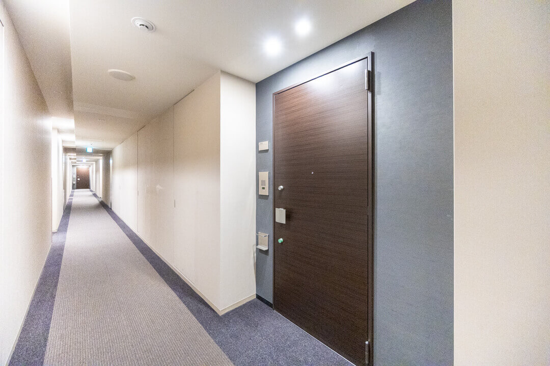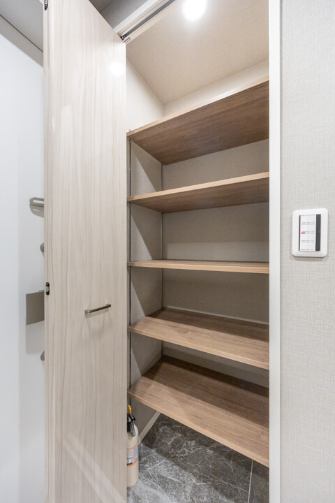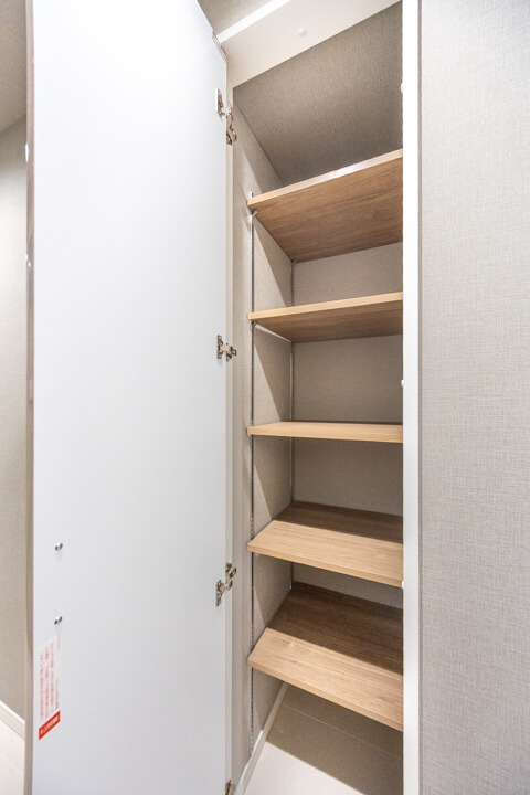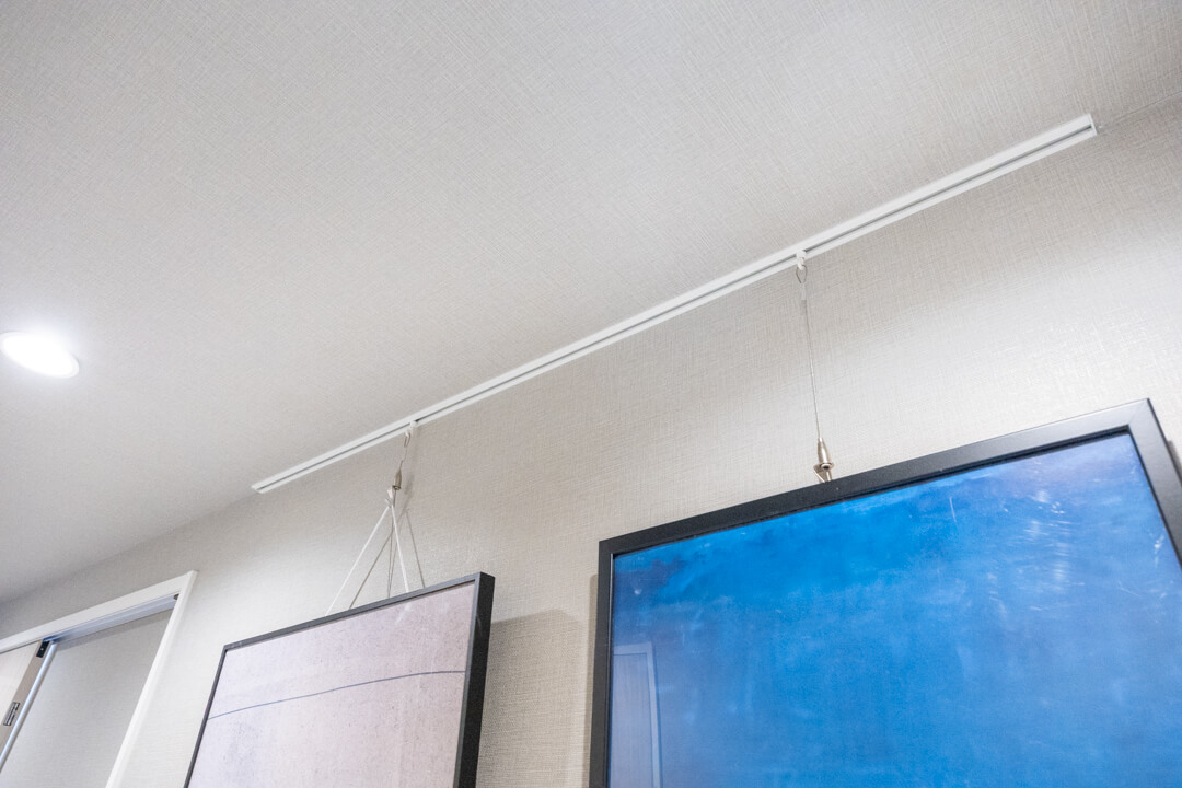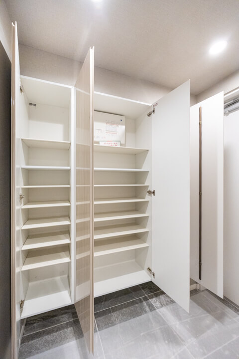 玄関には4枚扉のシューズボックス完備で靴がたっぷりと収納可能。扉の一面が姿見になっていてお出かけ前の身だしなみチェックもできます。また、シューズボックスの他にも玄関と廊下にひとつずつ物入が設けられていて、生活用品の収納に便利です。廊下にはピクチャーレールが設置されており、壁にキズをつけずにアートや写真が飾れます。
