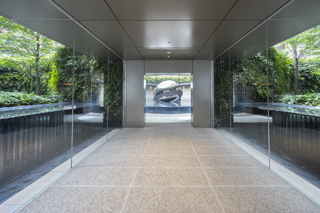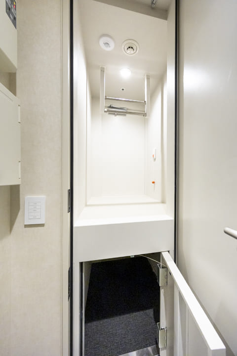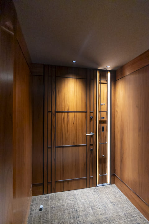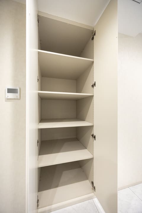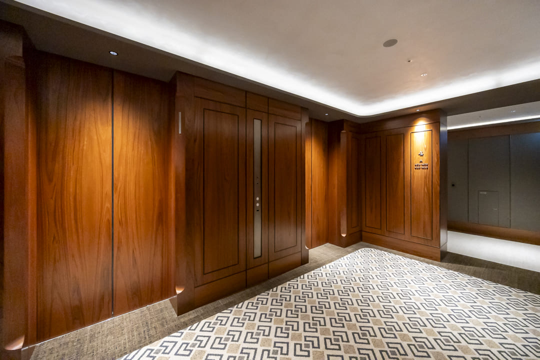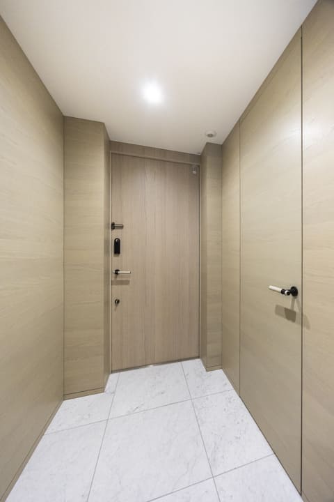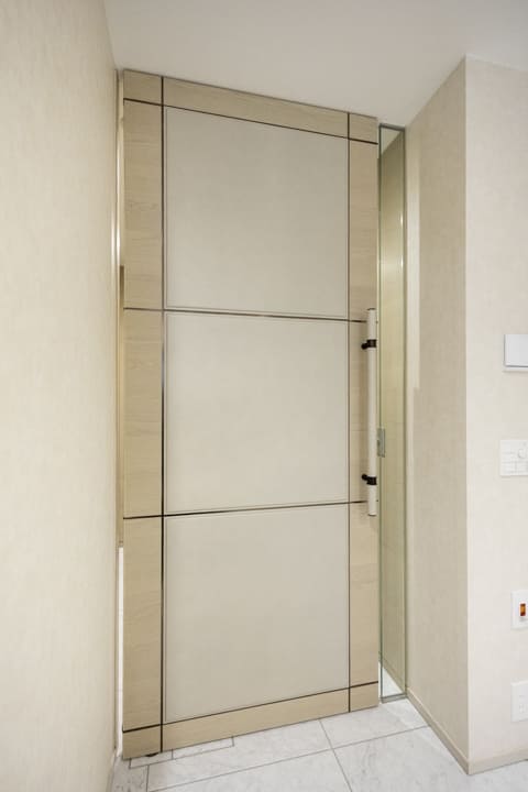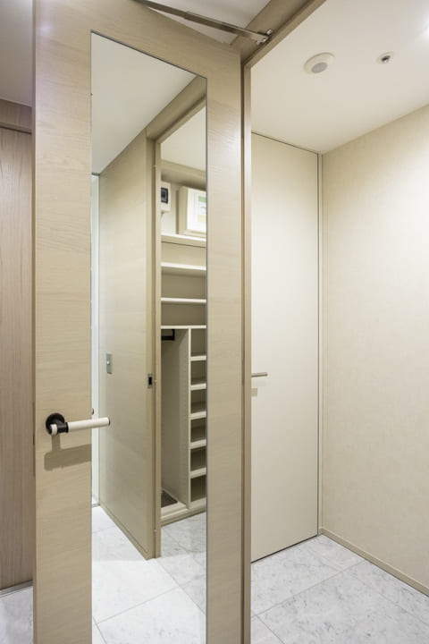 ホテルライクな玄関ホール。SIC(シューズインクローゼット)を備え、収納豊富です。靴はもちろん、雨具なども収納でき、いつも清潔な空間をキープ。扉裏が鏡張りになっていて、お出かけ前のコーディネートチェックができるのも嬉しいポイントです。さらに、奥にはバトラースペースがあり、クリーニングや宅配物の受け取り、ゴミ出し等が可能。パークマンション棟の入居者様限定サービスで、快適な毎日をサポートしてくれます。