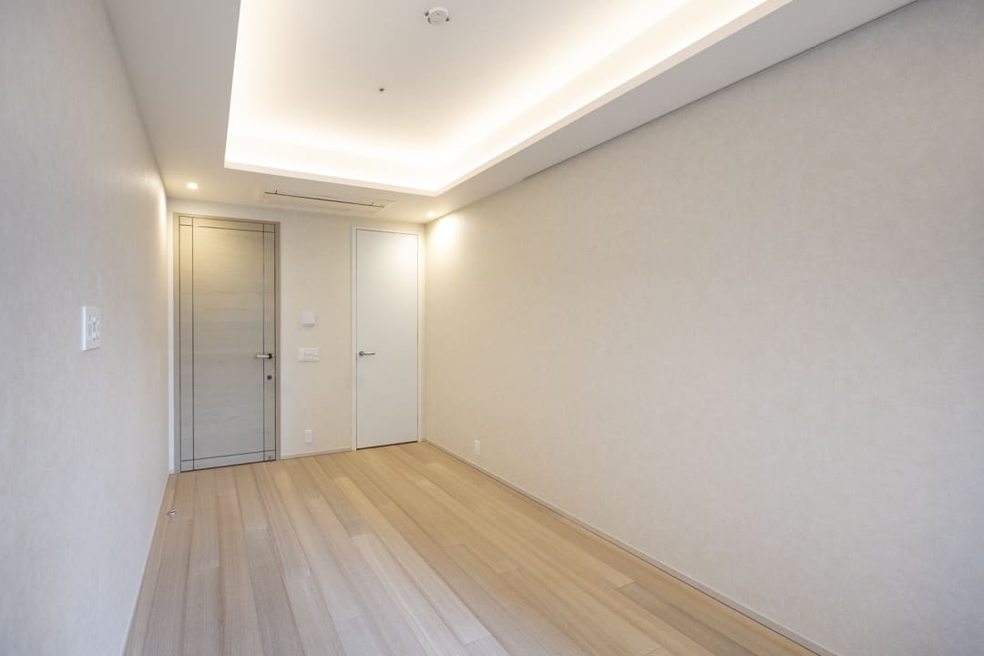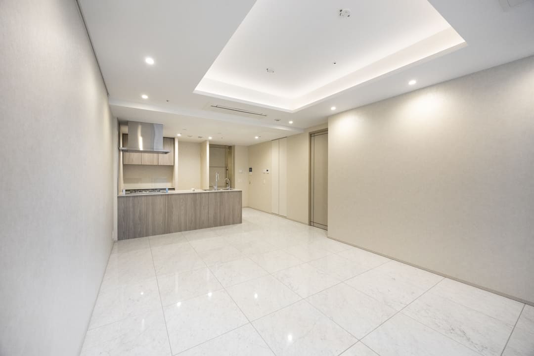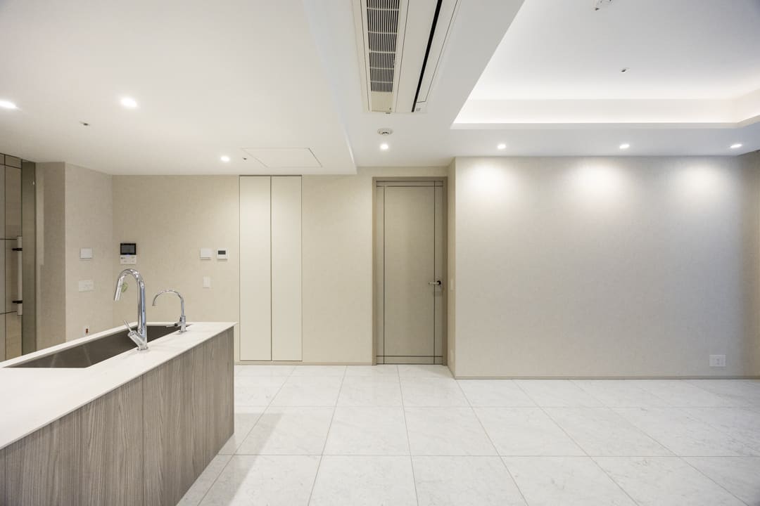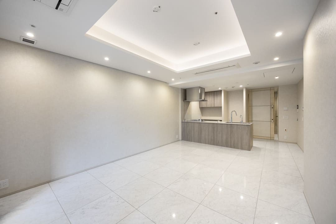 約22.0帖のゆとりあるLDK。光沢のあるフロアと折り上げ天井、間接照明が織りなす洗練されたデザインが、ホテルライクな上質空間を演出します。バルコニーへと視線が抜けるレイアウトで、室内と屋外の床色が近いため、ひと続きのような奥行きと広がりを感じられるのも魅力。日常をワンランク上に引き上げてくれる、心地よい寛ぎの場です。