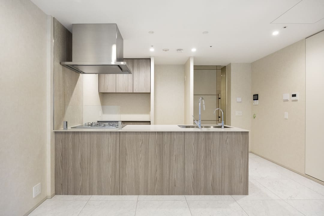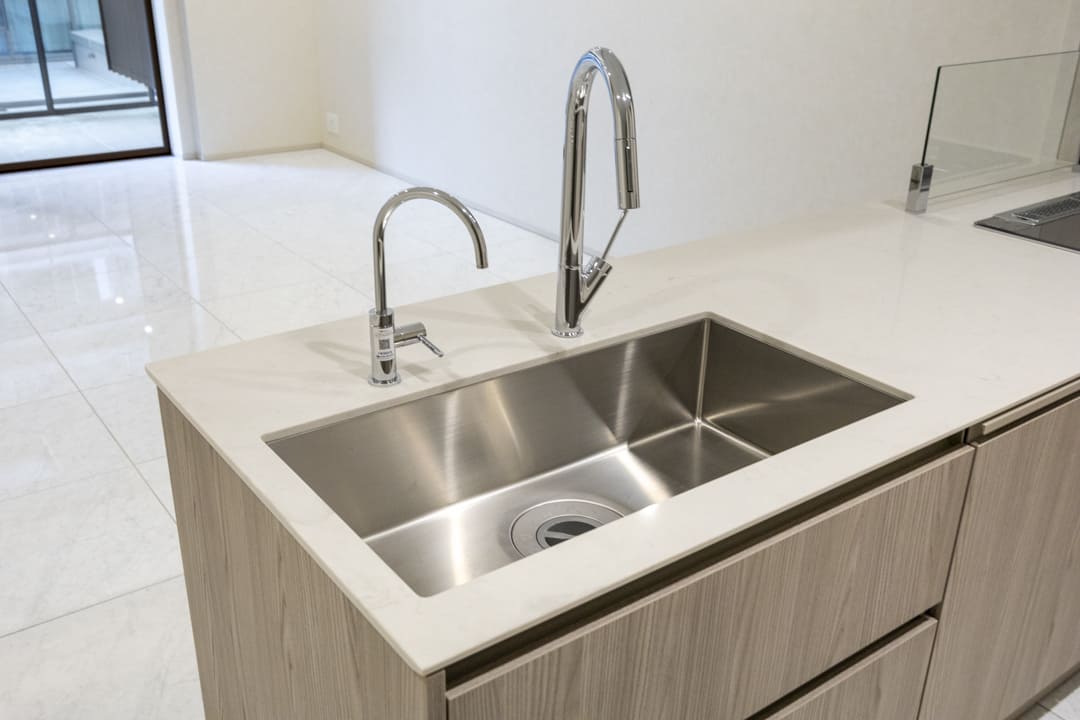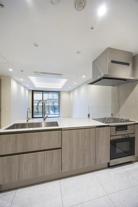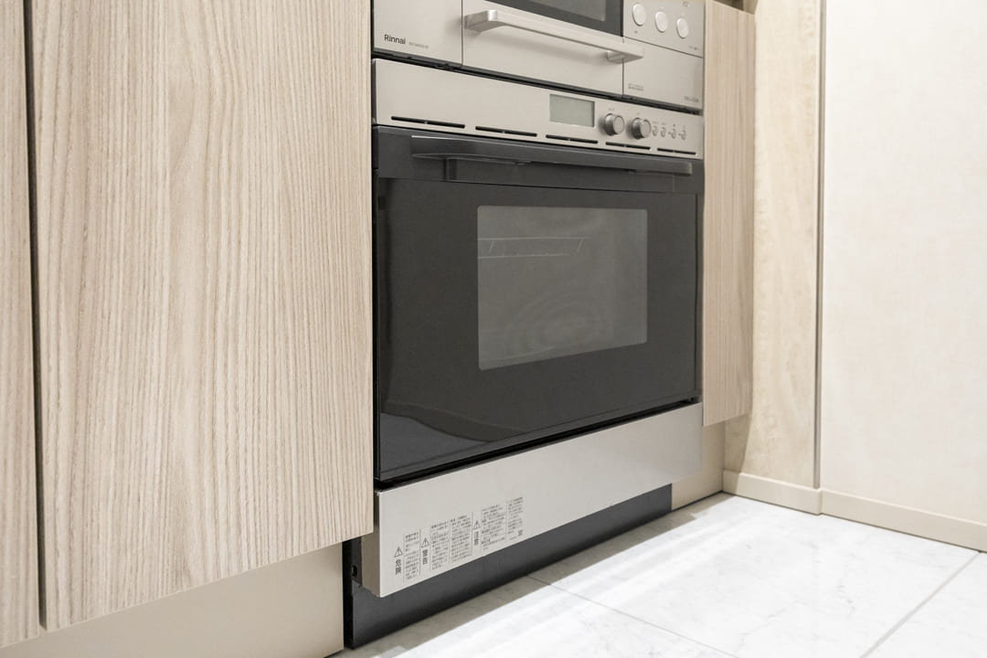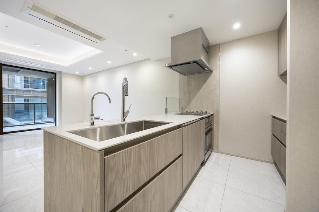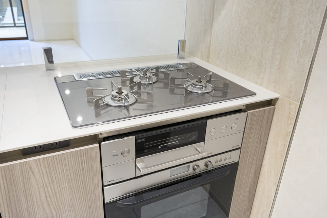 グリル付3口ガスコンロとオーブンを備え、調理の幅が広がる機能的な仕様。Miele(ミーレ)製の食洗機やディスポーザーを搭載し、後片付けの負担を軽減します。浄水器も設置されていて、日々の飲料水や料理にも安心・快適にお使いいただけます。