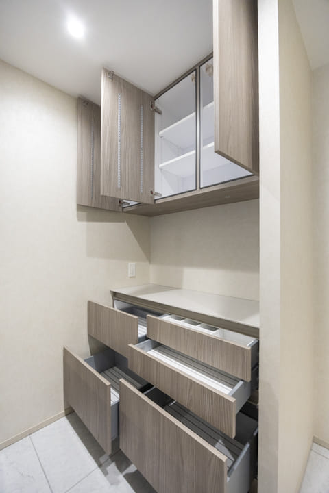 キッチンと統一感のあるカップボードを完備。食器や家電、調理器具までスマートに収納可能です。作業カウンターとしても活用でき、使い勝手とデザイン性を兼ね備えた、美しく整うキッチン空間を叶えます。