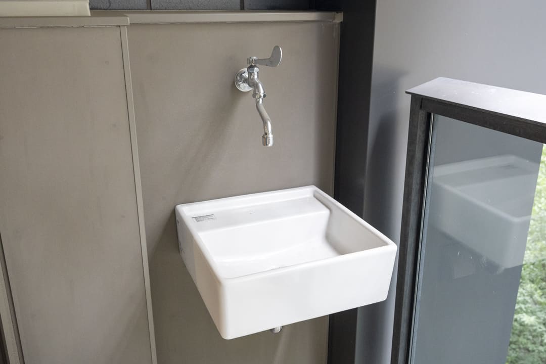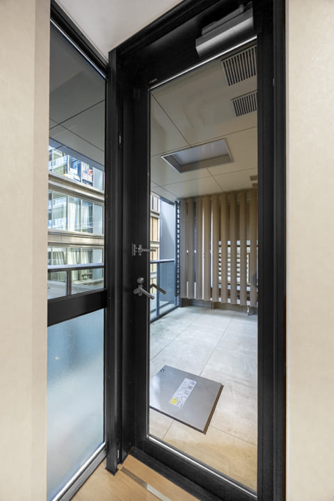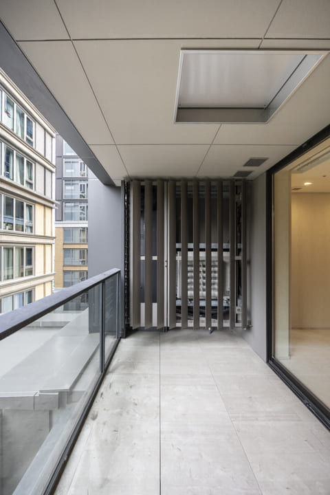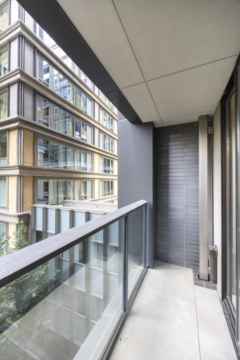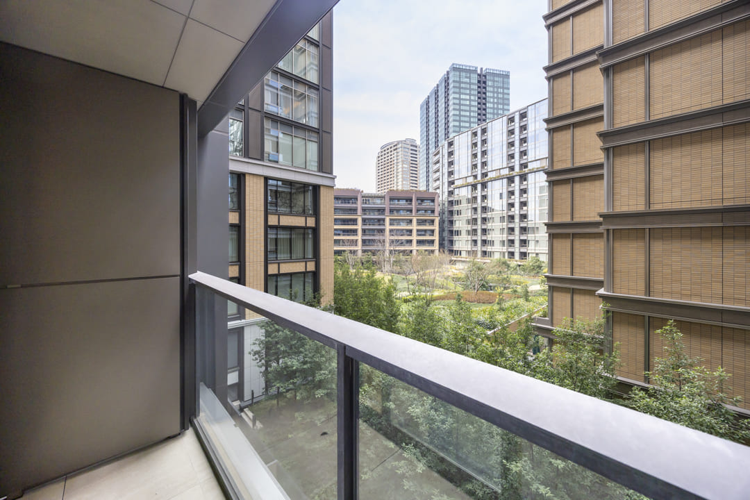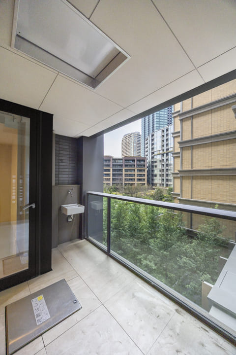 バルコニーは2ヶ所に設けられ、合計12.21㎡のゆとりある広さを確保。LDK側のメインバルコニーは奥行きがあり、開放感を感じられる空間です。正面には他棟がありますが、敷地内の木々の緑や、その奥に広がる中庭の景色が視界に入り、都心にいながらも穏やかな眺めを楽しめます。スロップシンク付きで、バルコニーのお掃除やお花の水やりに便利。実用性と心地よさを兼ね備えた、暮らしにゆとりをもたらす屋外空間です。