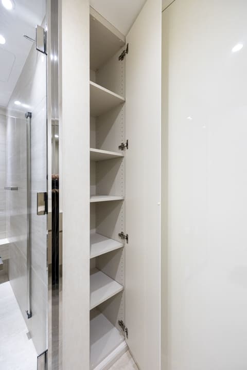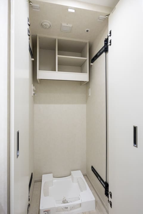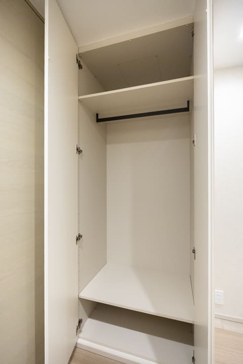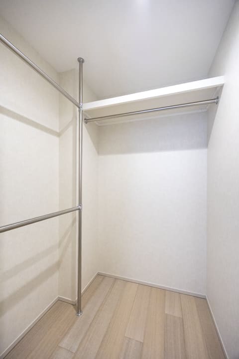 約1.5帖のWIC(ウォークインクローゼット)を備え、収納力に優れた設計。衣類はもちろん、トランクケースや季節家電などの大きな荷物もすっきりと収めることができます。ハンガーパイプは2段仕様となっており、丈の短い洋服を効率良く収納できるのも嬉しいポイント。さらに、扉裏には全身鏡を設け、日々のコーディネートチェックにも便利です。