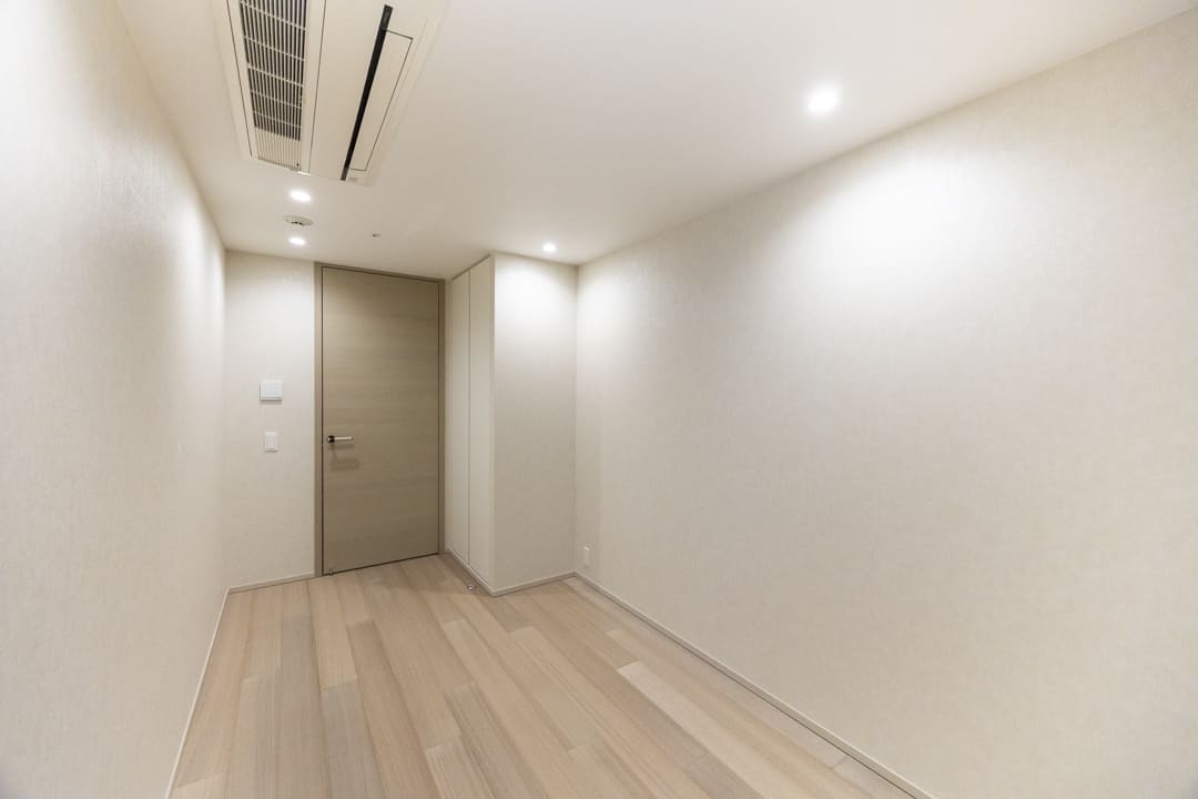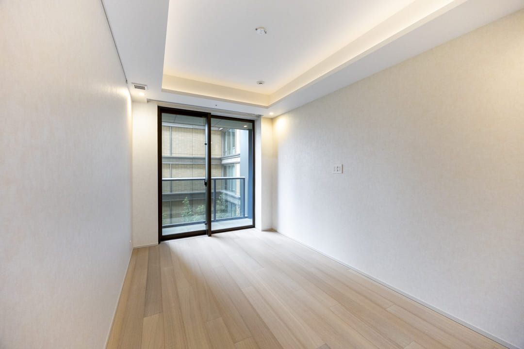 約5.7帖の寝室1。L字のハイサッシから心地よい光が届く空間です。リビング同様に床暖房とビルトインエアコンを備え、1年中快適に。クローゼット完備で収納スペースもしっかり確保されています。