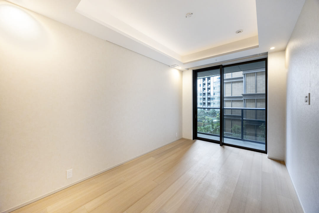 お隣にあるのは約7.6帖の寝室2。バルコニーに面した開放感のある空間で、主寝室にぴったりです。窓から木々の緑が見えるのも魅力的ですね。ピクチャーレールを活用してポスターやエアプランツを飾り、自分好みのお部屋づくりをお楽しみいただけます。