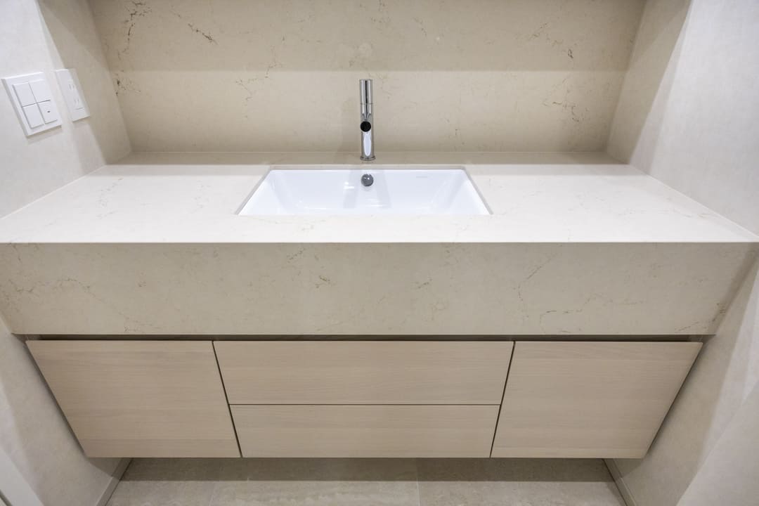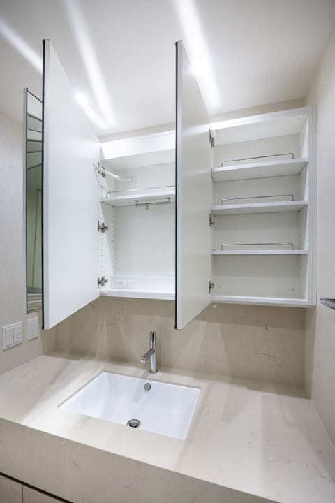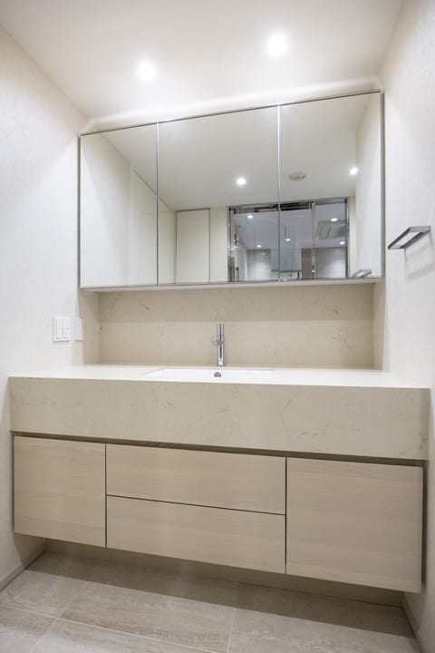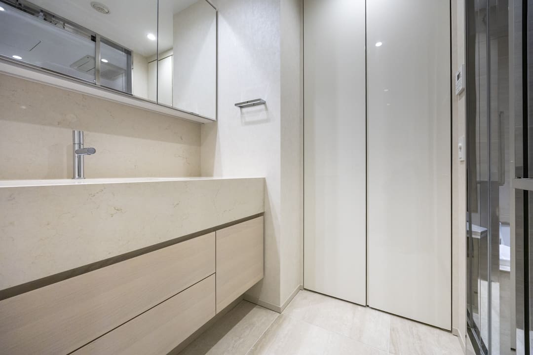 ゆとりある石調カウンターが、上質な存在感をもたらす洗面化粧台。化粧品やドライヤーをゆったりと仮置きでき、忙しい朝の身支度も落ち着いて行えます。大きな三面鏡を備え、身だしなみを整えやすいのも嬉しいポイント。ミラーボックス内は収納棚になっていて、洗面まわりの小物をすっきりと整理できます。足元の引き出し収納やリネン庫も完備し、収納力にも配慮。洗濯機置き場には扉を設け、生活感を抑えた美しい空間を保てるのも魅力です。