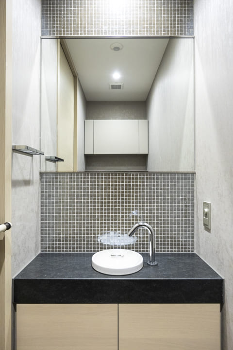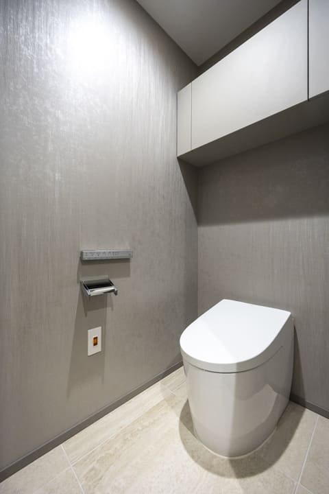 玄関近くに配置されており、プライバシー性の高いレストルーム。TOTO製のタンクレストイレを採用し、すっきりとした美しい佇まいを実現しています。便フタは自動開閉式のため、かがむ動作を減らし、身体への負担を軽減。正面には手洗いカウンターを備え、洗面室へ案内する必要がなく、来訪者にも配慮された使い勝手の良い空間です。