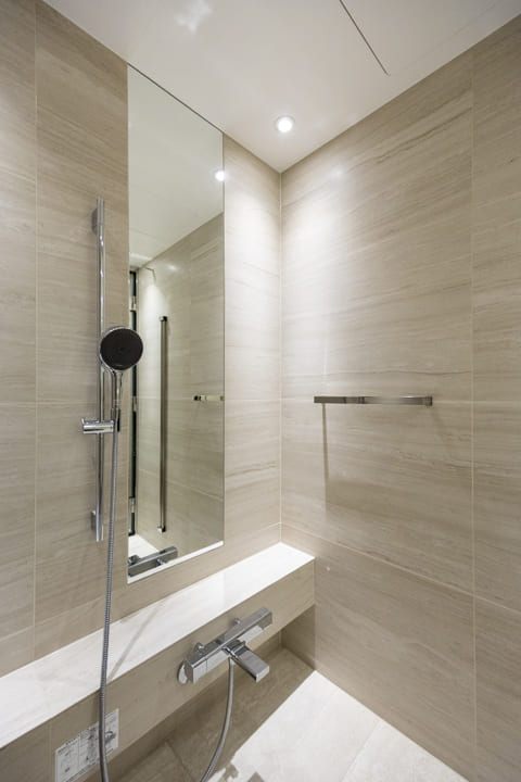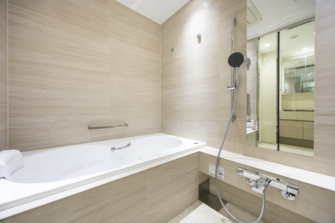 やわらかな木目デザインが、落ち着きと温もりをもたらすバスルーム。jaxson製の浴槽にはヘッドレストやステップを備え、身体をやさしく支えながら快適なバスタイムを叶えます。浴室換気乾燥暖房機と追い焚き機能を搭載し、寒い季節や雨の日でも快適な入浴環境をキープ。シャワーにはハンスグローエの「レインフィニティ」シリーズを採用しています。きめ細かな水滴がやさしく包み込むモードや、心地よい浴感を楽しめるモードなど、3種類の吐水を使い分けられ、気分やシーンに合わせた快適なシャワータイムをお楽しみいただけます。